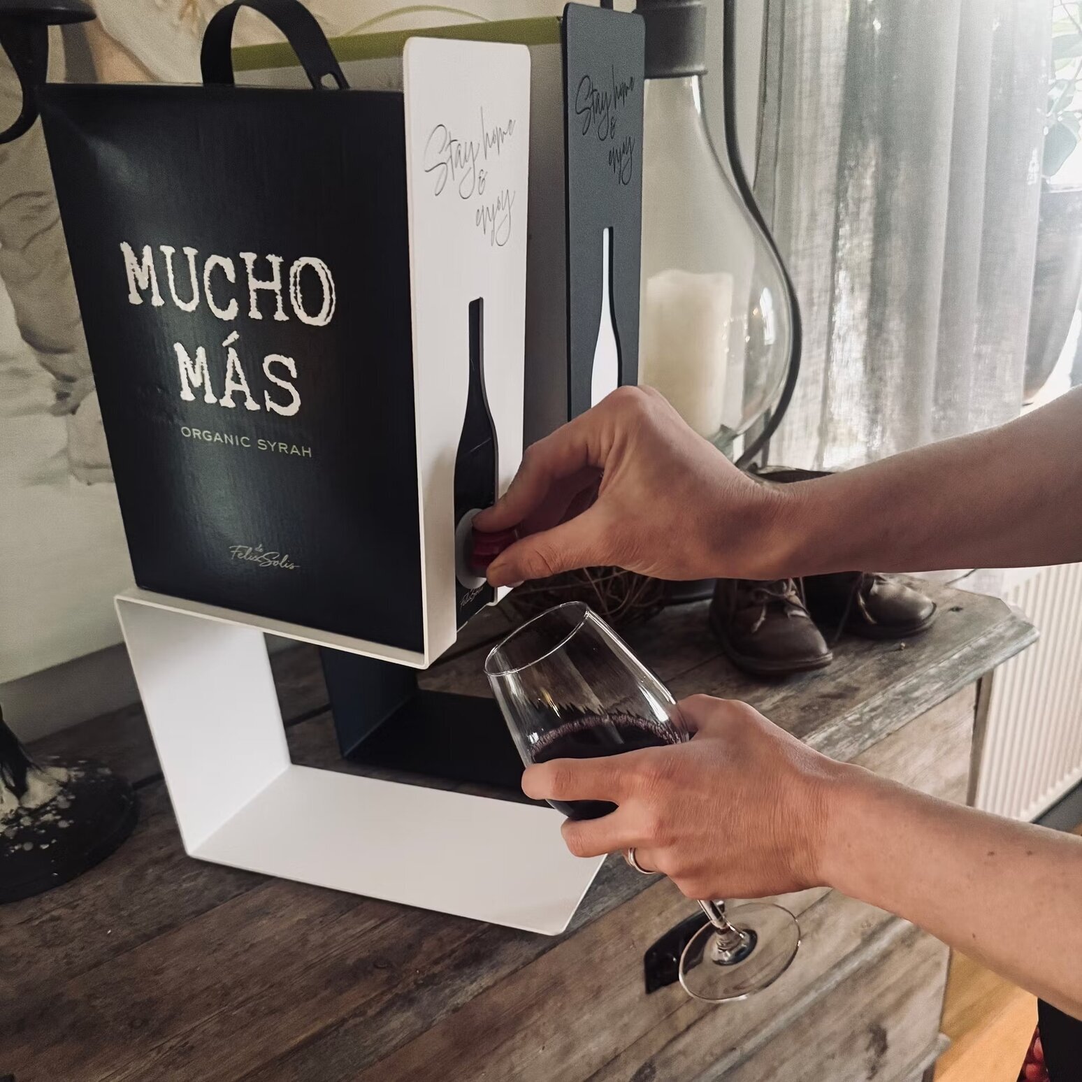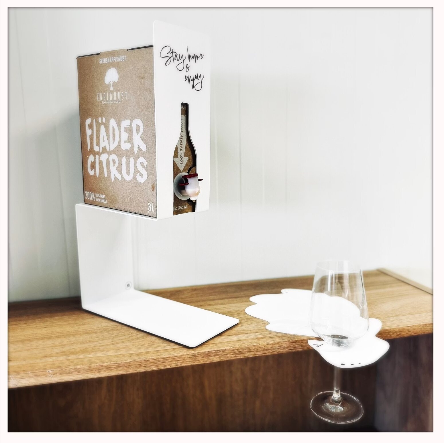 Ett stilrent och praktiskt vinställ för bag-in-box som lyfter både funktion och känsla i hemmet. Den smarta designen gör det enkelt att tappa upp vin direkt i glaset, samtidigt som boxen får en elegant och diskret plats på köksbänken eller serveringsbordet.