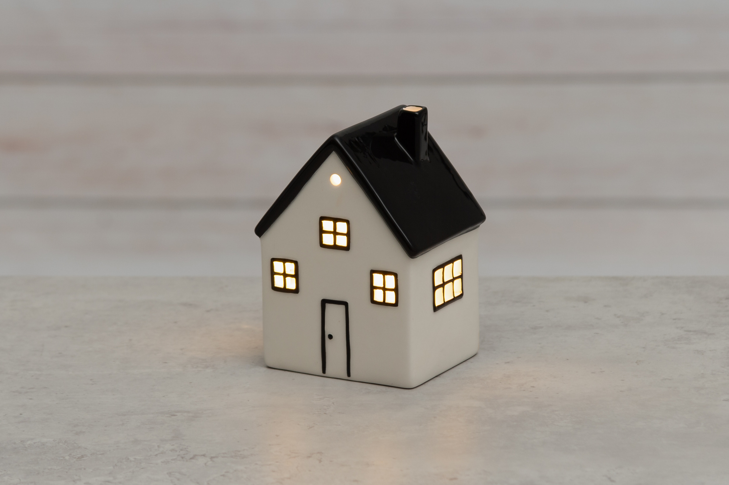Ett stilrent keramikhus i svart och vitt som sprider ett varmt sken genom sina små fönster. Läs mer