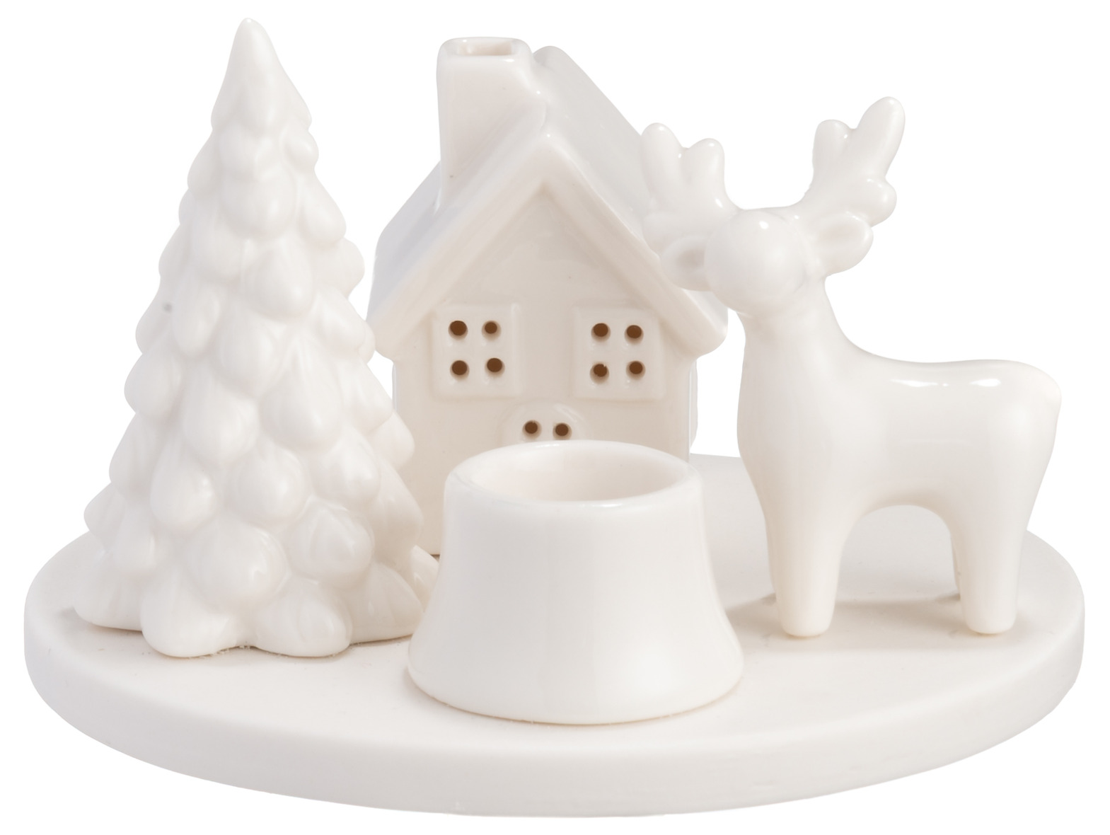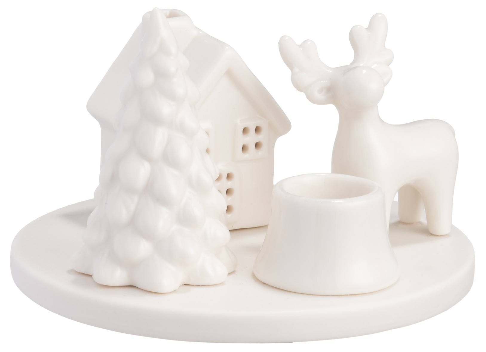 En stilren ljusstake som kombinerar hus, gran och ren på en rund bricka. Med plats för ett kronljus sprider den ett varmt och behagligt sken som skapar en inbjudande atmosfär.