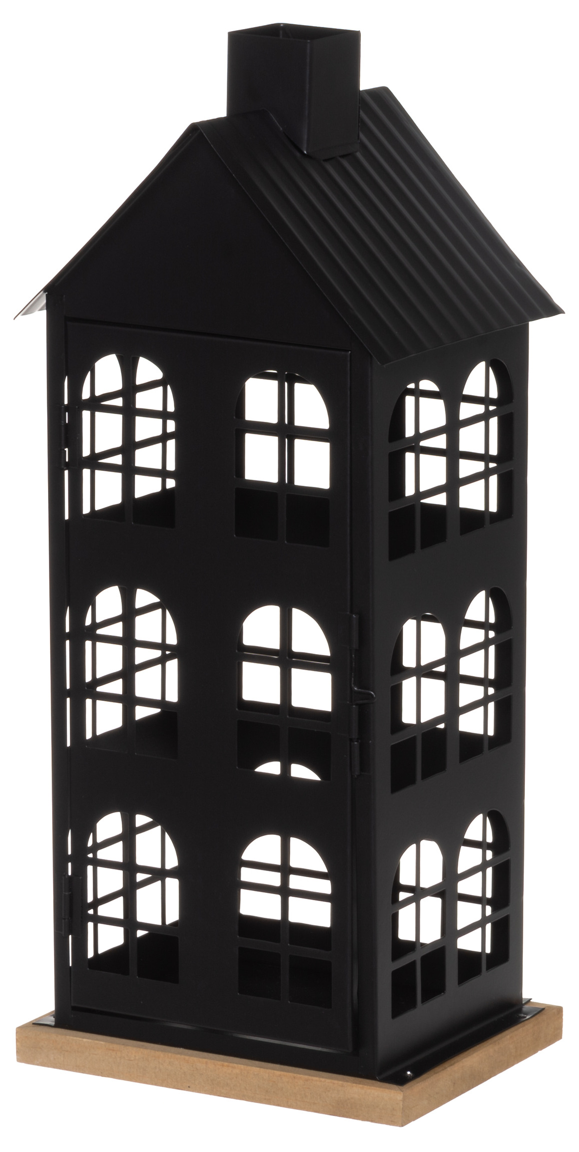 Ge ditt hem en mysig och stämningsfull känsla med denna dekorativa huslykta i svart metall. Den charmiga designen, formad som ett litet hus med fönster och skorsten, sprider ett varmt och inbjudande sken när du placerar ett LED-ljus inuti. Perfekt att ställa på bordet, i fönstret eller på altanen för att skapa en hemtrevlig atmosfär året runt.