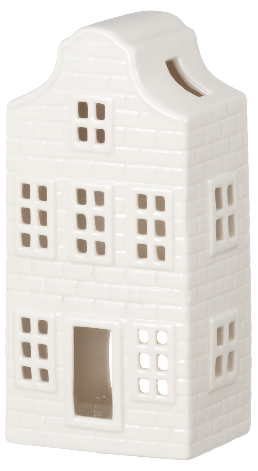 En elegant ljuslykta formad som ett högt hus med fina detaljer och rundad gavel. Den vita fasaden med sina många små fönster låter ljuset strömma ut och skapa en varm och inbjudande atmosfär.