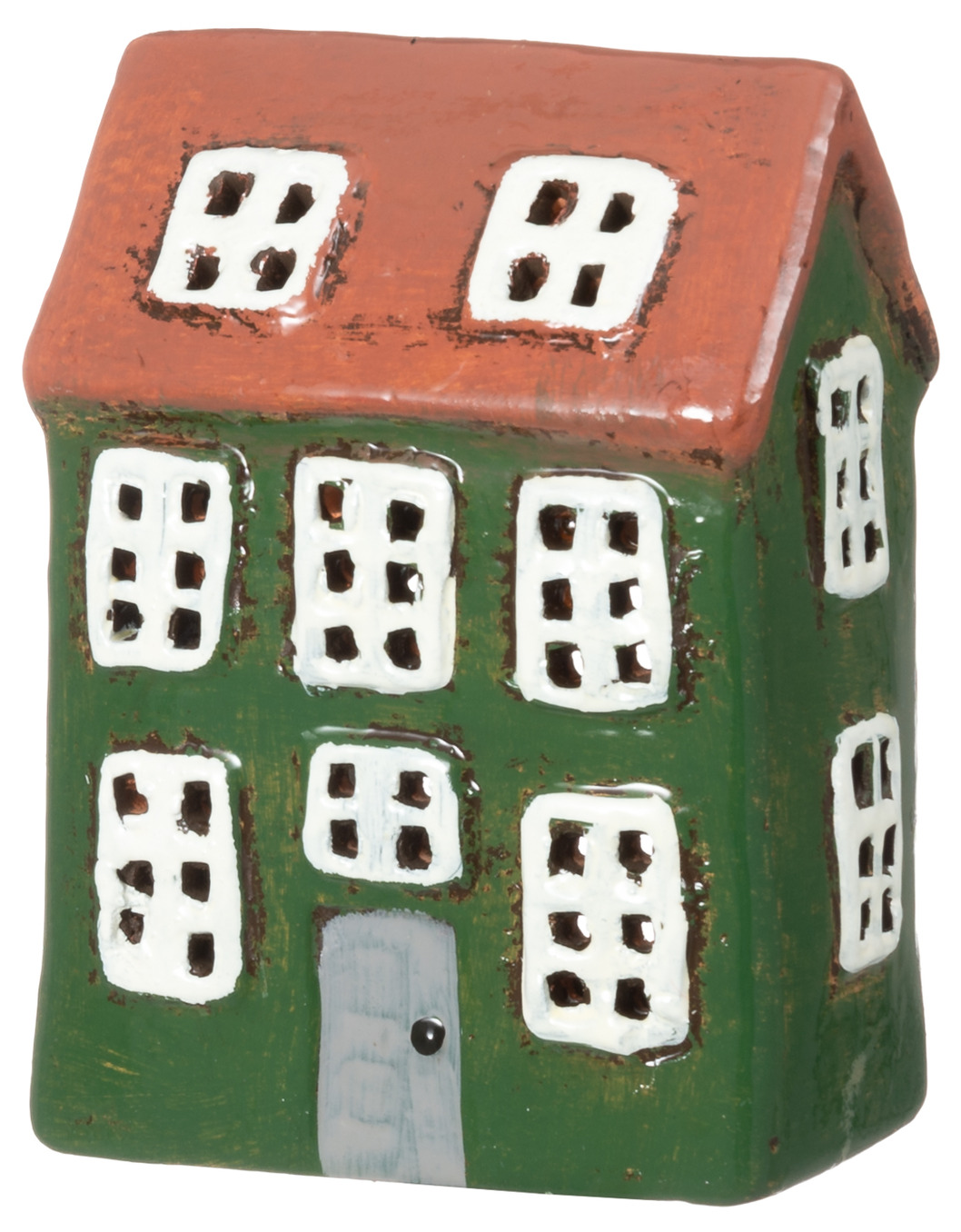 Ge hemmet en färgklick med denna härliga ljuslykta i form av ett hus. Den gröna fasaden och det röda taket gör den både lekfull och dekorativ. När du tänder ett ljus sprider sig ett varmt sken genom de små fönstren och skapar direkt en mysig stämning. Perfekt detalj för att liva upp fönstret, hyllan eller bordet.