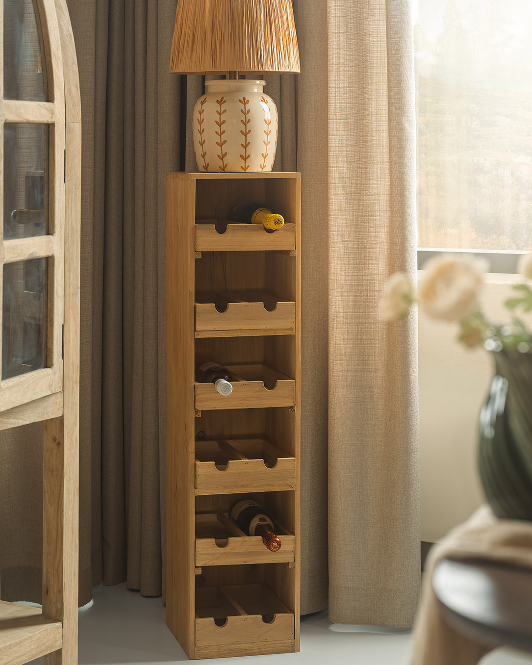 Det här stilrena vinstället i trä är en både praktisk och snygg lösning för dig som vill förvara dina vinflaskor på ett ordnat sätt – utan att kompromissa med känslan i rummet.