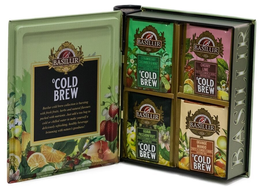 En vacker tebok fylld med uppfriskande Cold Brew iste – perfekt för dig som vill ha ett riktigt gott, koffeinfritt alternativ i vardagen. Basilur kombinerar noga utvalda ingredienser med naturliga aromer och en lätt sötma från stevia, vilket ger en fräsch och balanserad smak. Här får du flera fruktiga favoriter som är gjorda för att bryggas direkt i kallt vatten. Perfekt för hela familjen, varma dagar, picknick – eller som en lyxig present.
