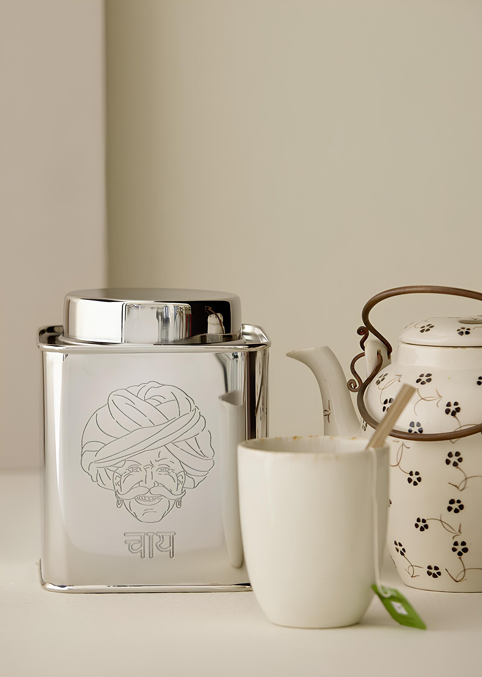 Förvara ditt te på ett både praktiskt och vackert sätt med denna eleganta plåtburk i rostfritt stål. Den blanka ytan och den dekorativa präglingen ger burken en stilren känsla som passar lika bra på köksbänken som i skafferiet eller på en öppen hylla.