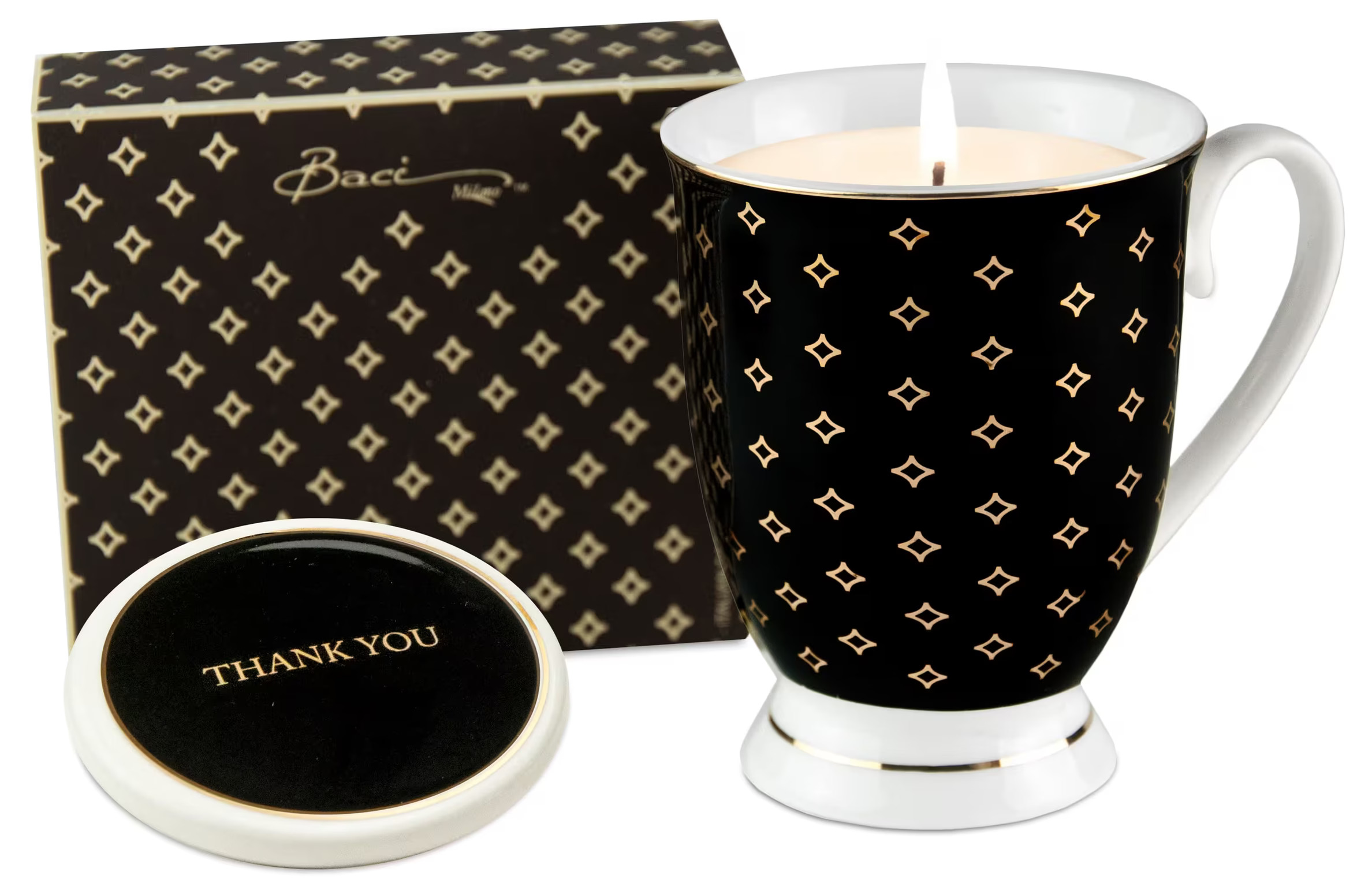 Doftljuset Thank You från BOXinBAG kommer även med ett passande lock. Locket är svart med texten THANK YOU tydligt präglad i guld. Detta lock fyller en praktisk funktion genom att skydda ljuset från damm när det inte används och bibehåller dess doft längre. Locket bär samma eleganta designprinciper som muggen och kompletterar den visuella helheten på ett harmoniskt sätt.