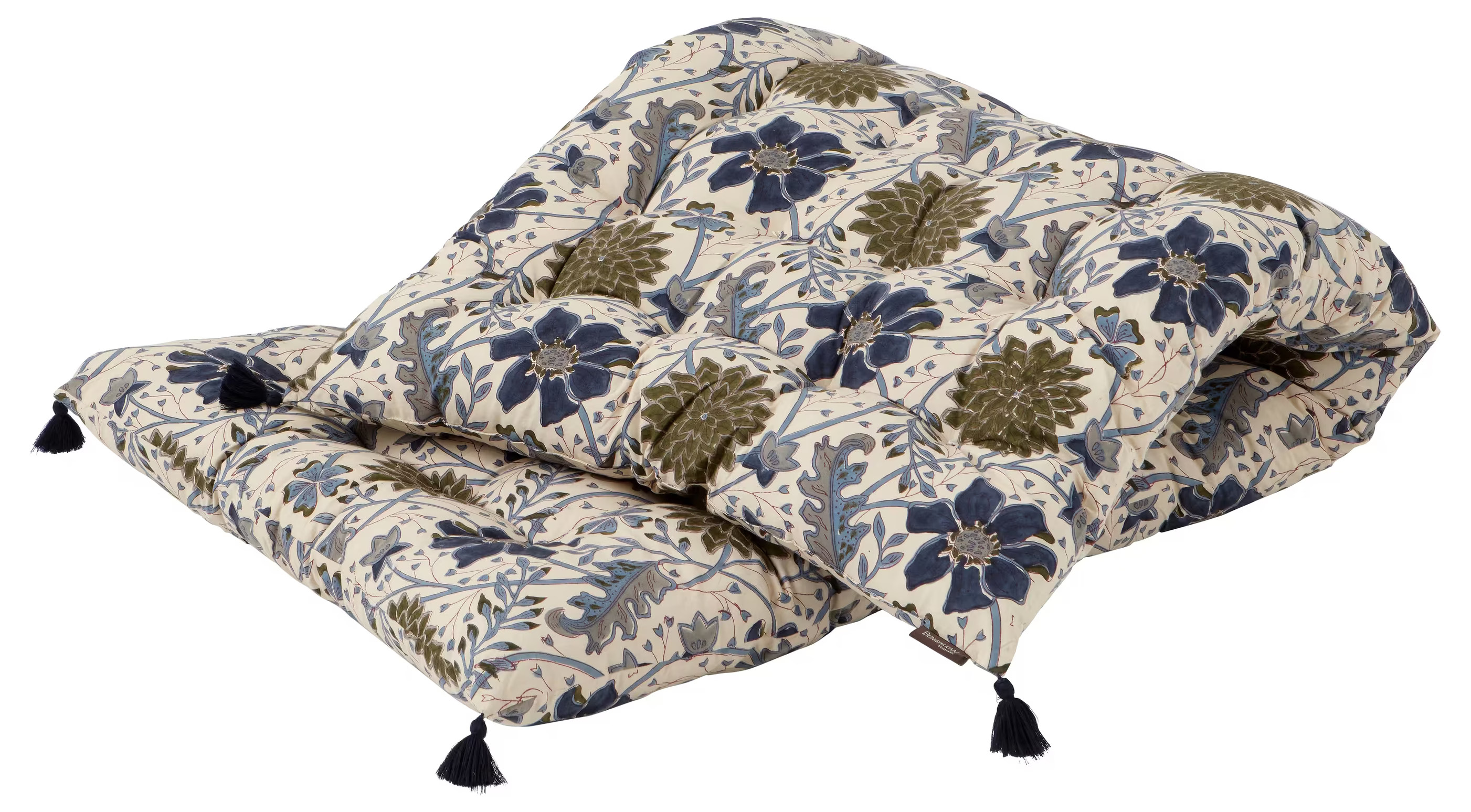 Madrass i en vacker blå/grön nyans med mönster & tofsar från Bungalow Denmark. Madrassen som är fylld med 100% polyester kan användas till bänkar, solsängar eller fristående på marken både inne- som utomhus. Madrasserna finns i en mängd olika färger & storlekar. Undvik att placera i direkt solljus då tyget kan blekas.