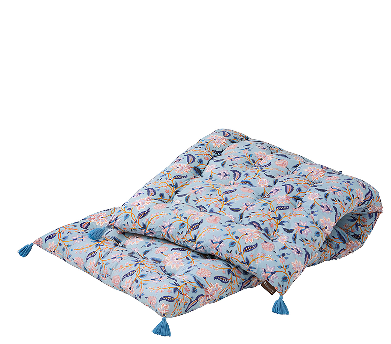 Överdraget är tillverkat i 100 % bomull med handgjort blocktryck, vilket gör varje madrass unik med sin egen karaktär. Små variationer i färg och detaljer är en del av det hantverksmässiga uttrycket. Fyllningen består av 100 % återvunnen polyester.