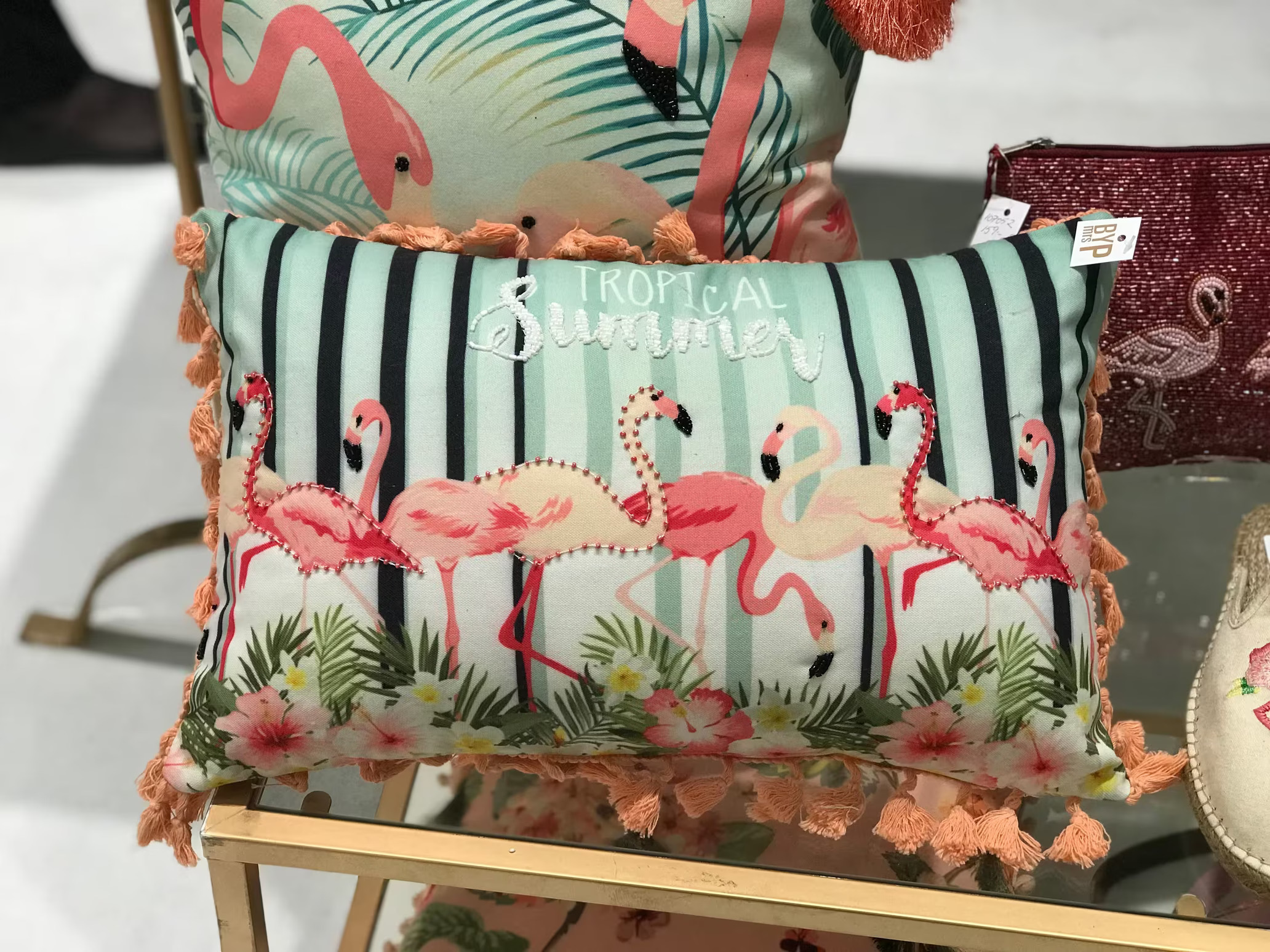 Kudden är placerad på en metallisk hylla tillsammans med andra produkter från samma varumärke, vilket ger ett sammanhängande intryck av en genomtänkt kollektion. I bakgrunden kan man skymta andra objekt, som en annan kudde med ett liknande flamingo-motiv samt en glittrande väska som ytterligare förstärker den tropiska och somriga atmosfären. Hyllans gyllene yta ger också en viss elegans och lyxkänsla till presentationen.