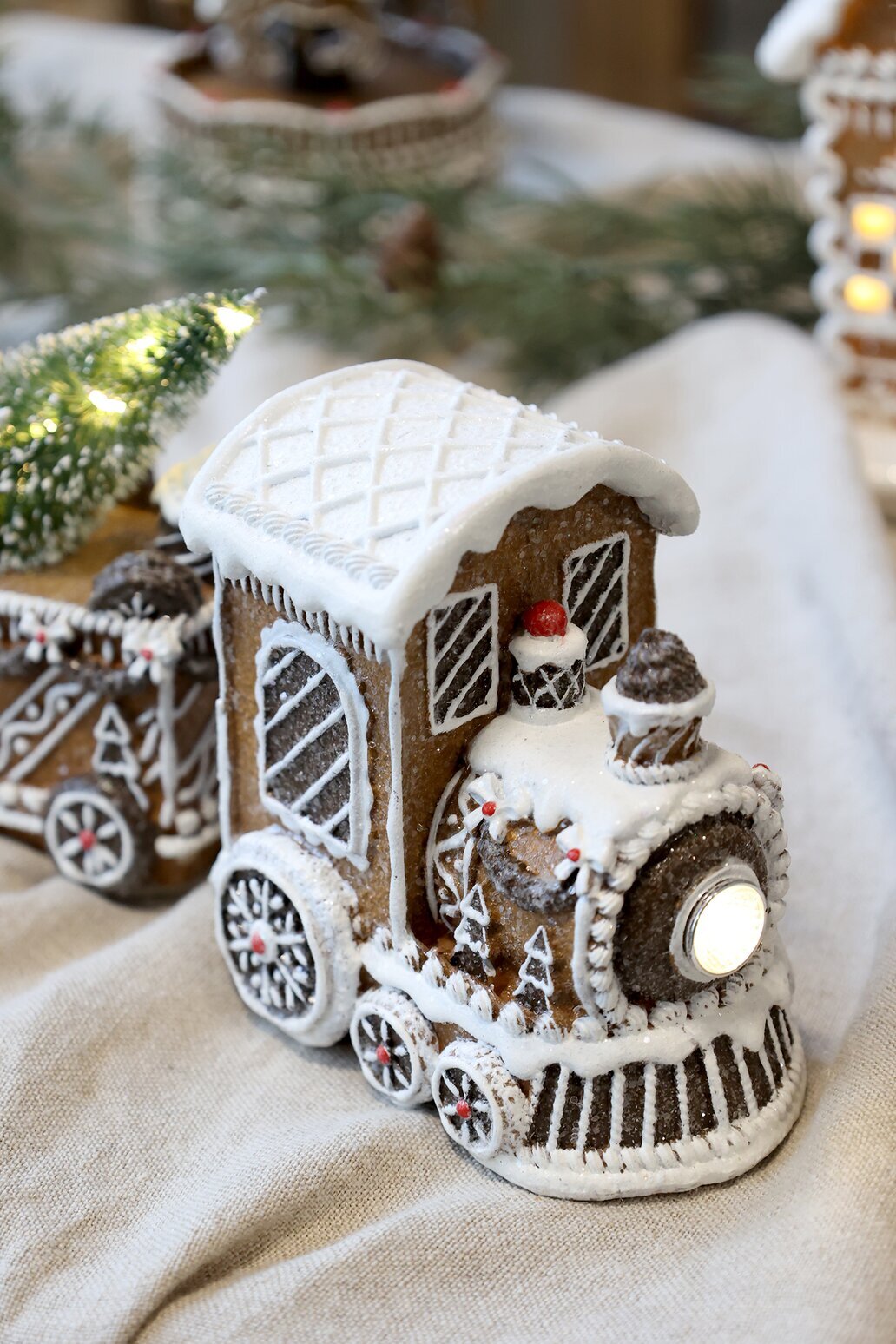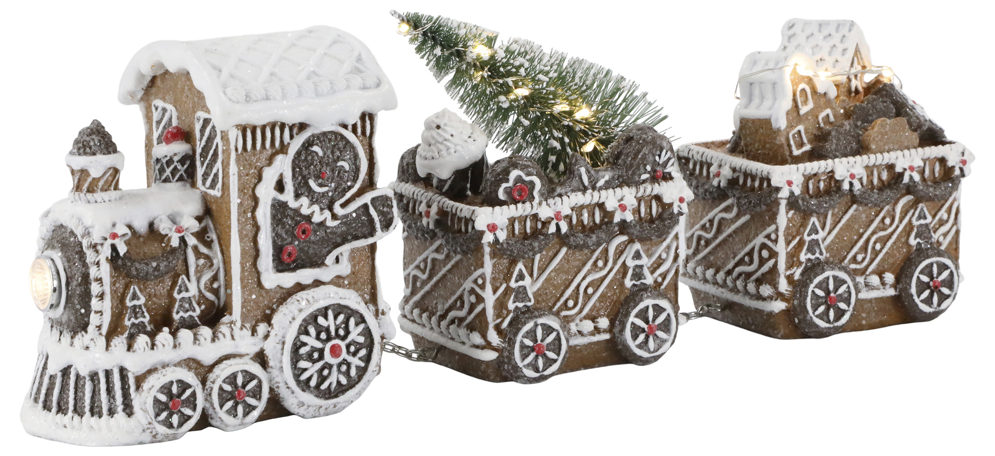 Ett charmigt jultåg i pepparkaksstil som sprider både ljus och julglädje. Tåget är handmålat med fina detaljer och lyser upp med små LED-lampor som gör dekorationen extra stämningsfull. Med den praktiska på/av-knappen är det enkelt att tända när du vill skapa mysig julstämning.