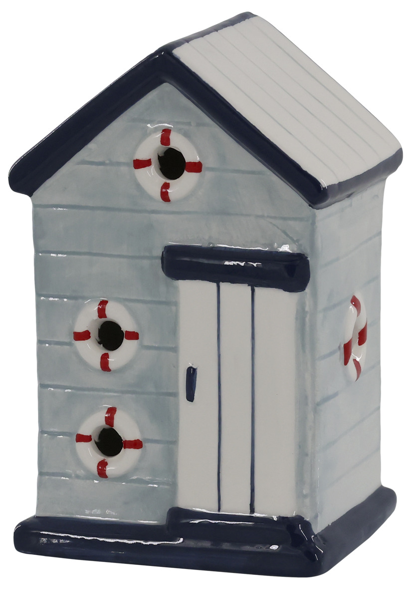Skapa en harmonisk kustkänsla i hemmet med detta charmiga strandhus i keramik. Med sina mjuka blå nyanser, vita detaljer och små livbojar på fasaden för tankarna direkt till havsbris, sand mellan tårna och lata sommardagar vid stranden.