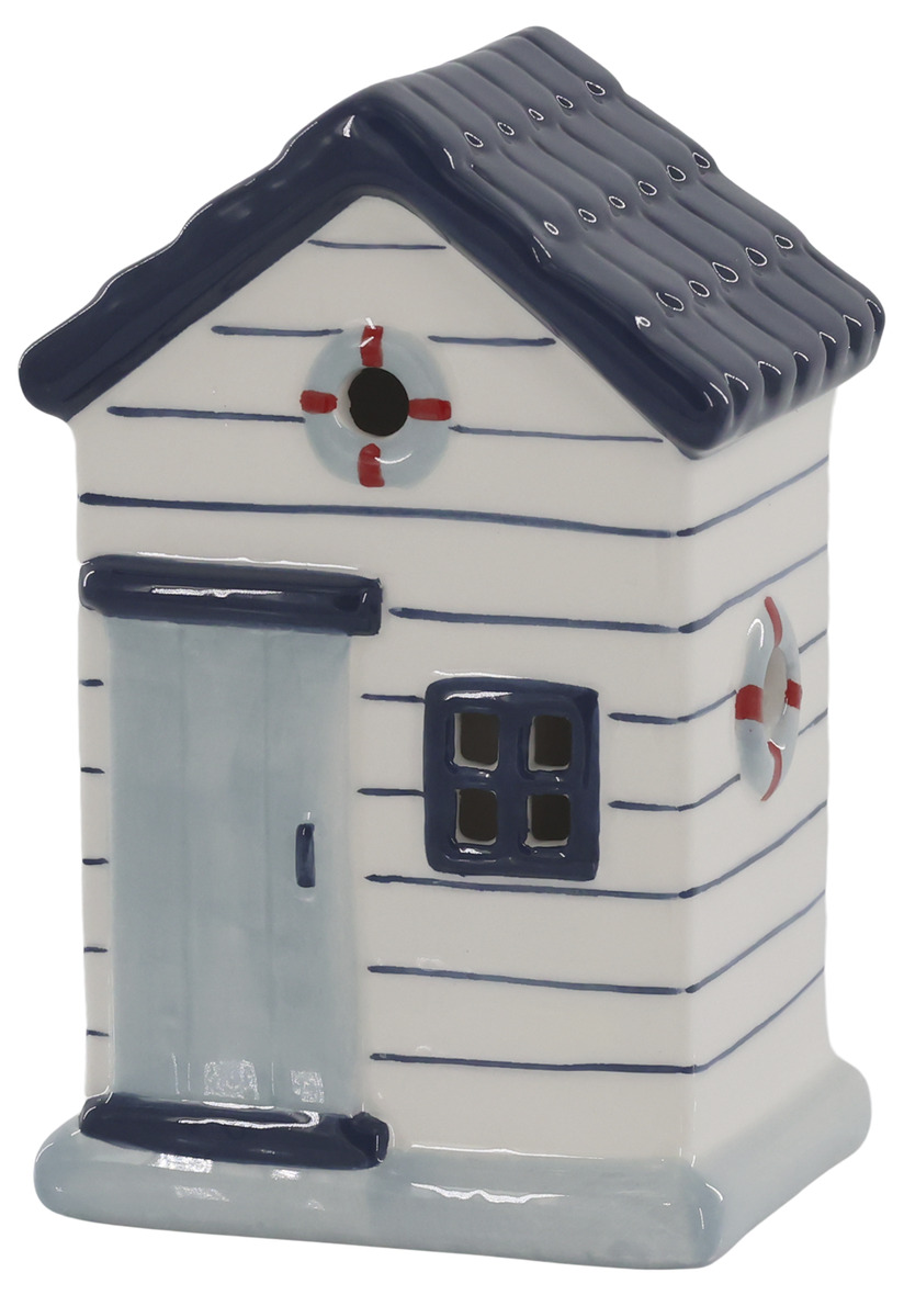 Låt hemmet andas hav och sommar med detta charmiga strandhus i keramik. De klassiska blå och vita tonerna tillsammans med små livbojar och handmålade detaljer skapar en tidlös maritim känsla.