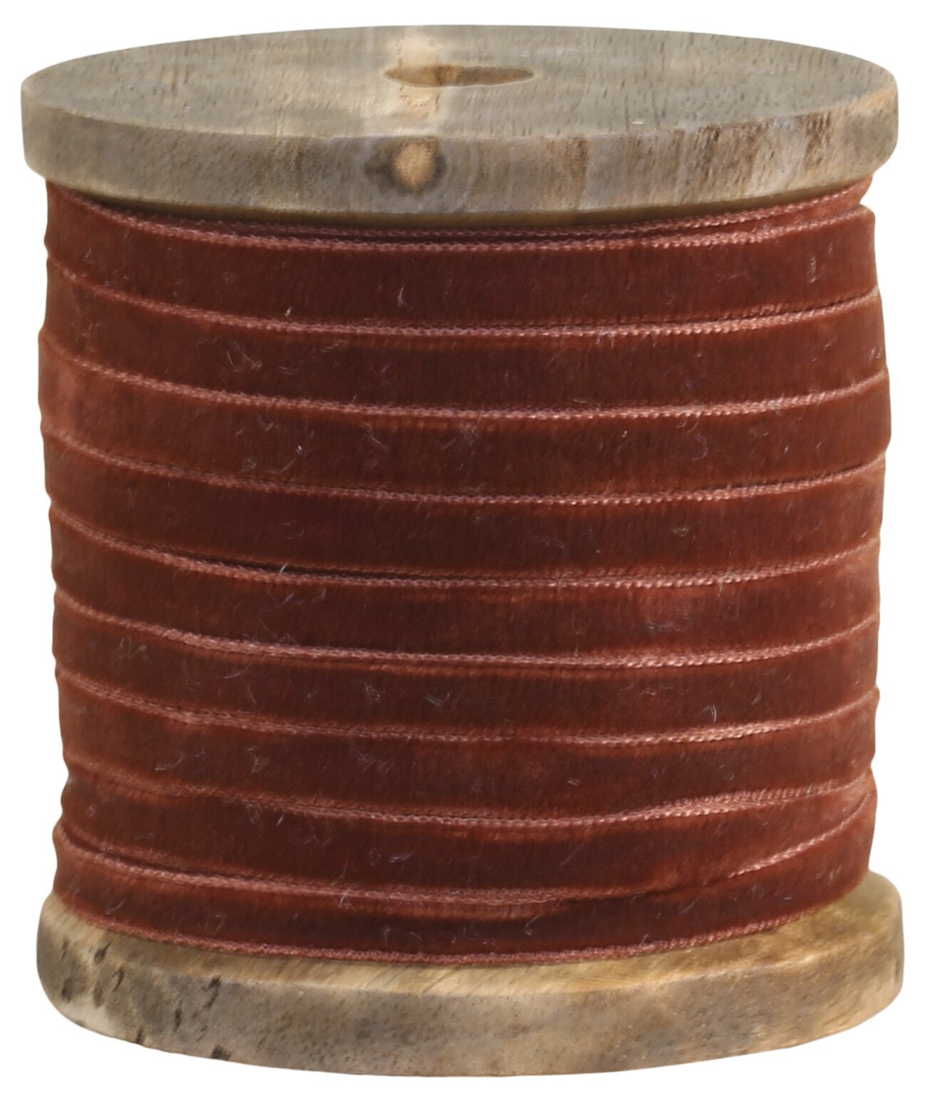 Velourband i vacker röd bordeaux på träspole till dekoration, finns i flera olika färger fina att dekorera på paket eller till upphängning av julkulor & andra dekorationer.