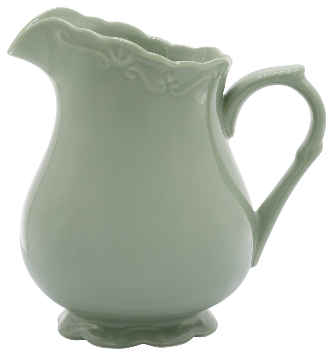 Elegant kanna i keramik som har en mjukt rundad form och en vacker ljusgrön glasyr som ger ett lugnt och harmoniskt uttryck. De dekorativa detaljerna längs kanten och den klassiska formen ger kannan en tidlös känsla som passar lika bra till vardags som vid dukade tillfällen.