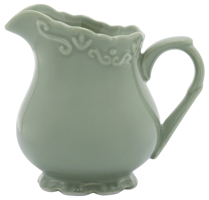 Liten kanna i keramik med en mjukt rundad form och en vacker ljusgrön glasyr som ger ett lugnt och harmoniskt uttryck. De dekorativa detaljerna längs kanten och den klassiska formen ger kannan en tidlös känsla som passar fint i både kök och på dukade bord.