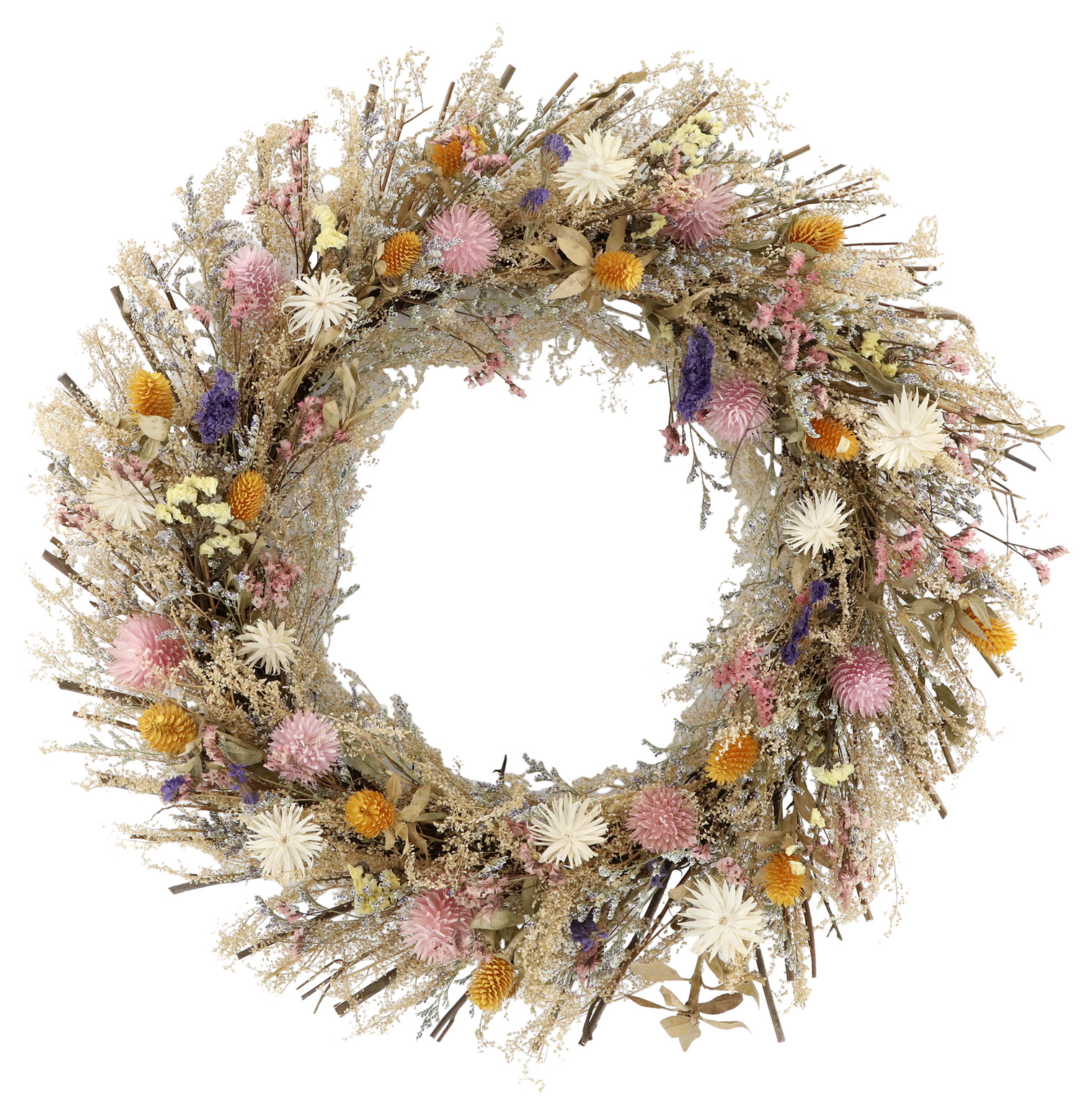 Låt naturens skönhet pryda ditt hem med denna ljuvliga blomkrans. Skapad av noggrant utvalda blommor i mjuka toner av rosa, vitt, gult och lila, ger den en romantisk och tidlös känsla till din inredning. Perfekt att hänga på en vägg, dörr eller som en stämningsfull dekoration i ett stilleben.
