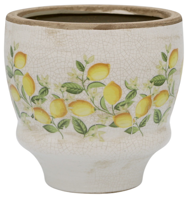 Ge ditt hem en fräsch dos medelhavskänsla. Den här krukan i krackelerad keramik pryds av ett mjukt citronmönster i solgula och gröna toner – en perfekt balans mellan lantlig charm och trendig retro.