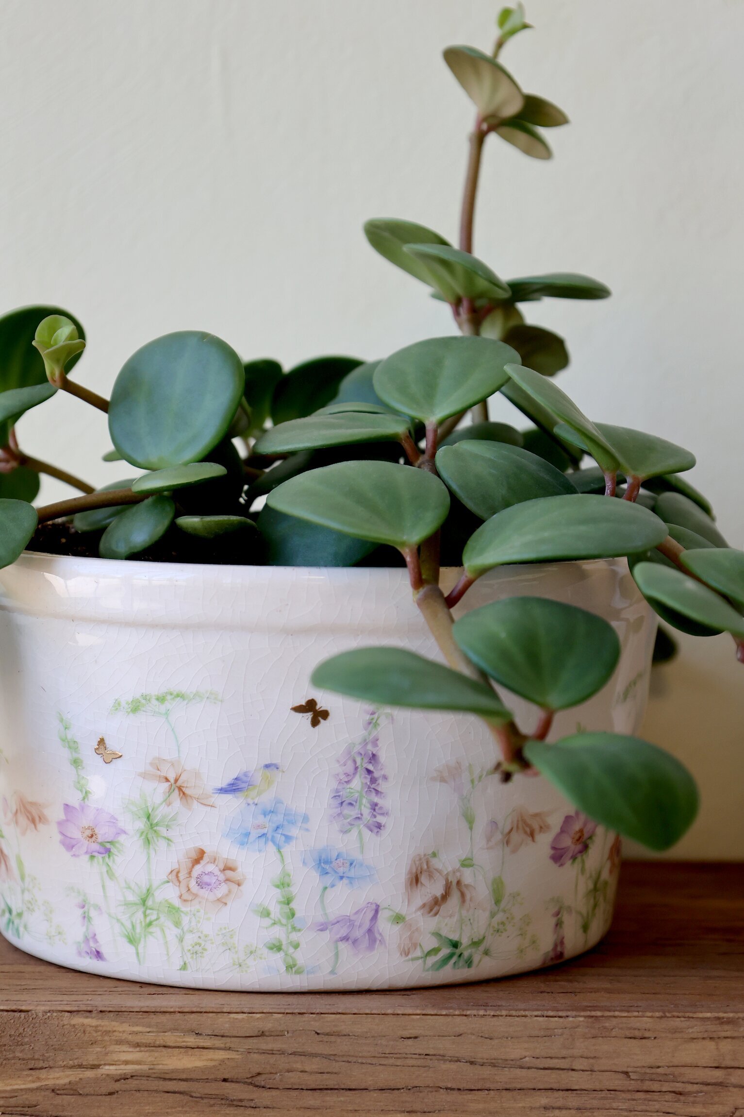 En vacker kruka i keramik med ett mjukt och romantiskt blommönster. De små blommorna i milda färger tillsammans med diskreta fjärilar ger ett lätt och somrigt uttryck som passar fint i både klassiska och lantliga miljöer.