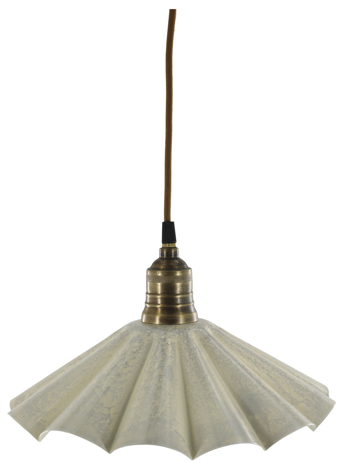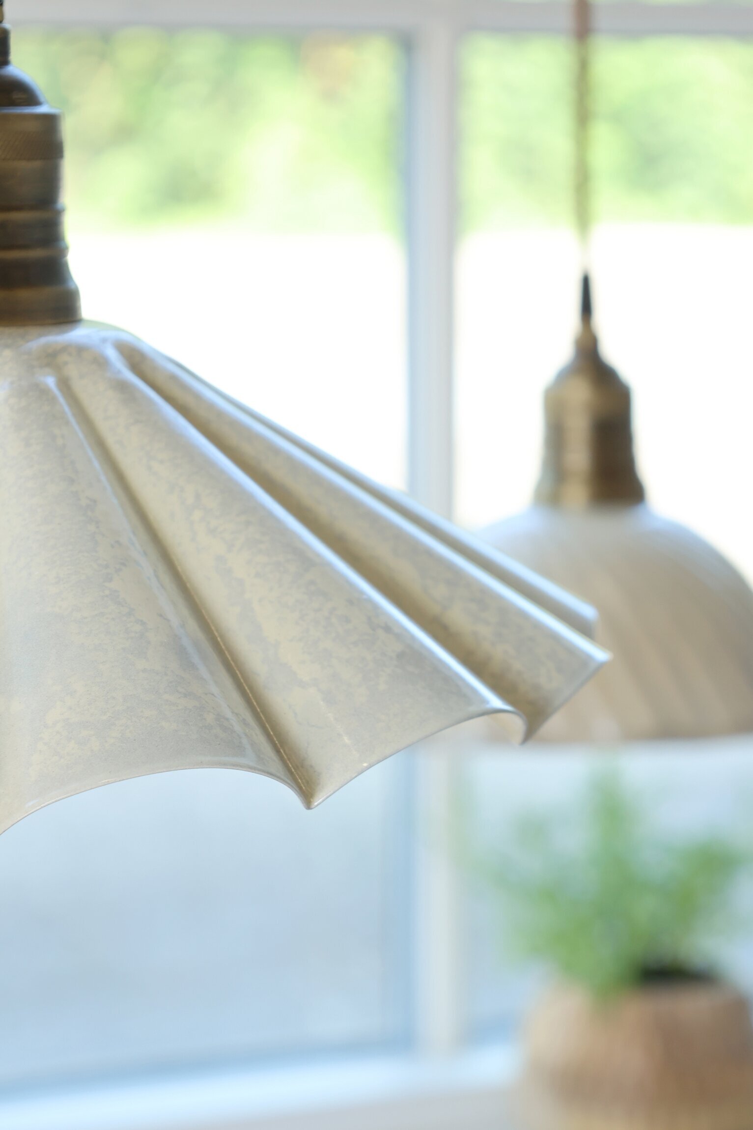 En tidlös pendellampa i cremefärgad emalj som ger ett mjukt, varmt sken och en elegant känsla i rummet. Den veckade formen fångar ljuset vackert och gör lampan lika fin över matbordet som i ett hörn där du vill skapa extra stämning.