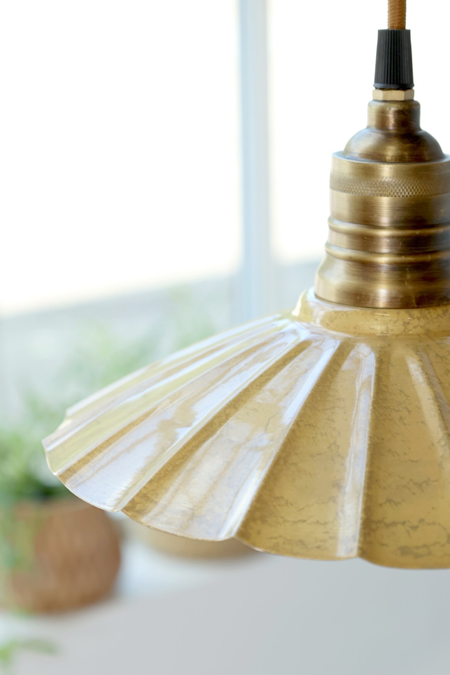 En stilfull pendellampa i varm, gyllene ton som ger rummet ett mjukt och inbjudande ljus. Den veckade, blomformade skärmen skapar ett elegant uttryck och fångar ljuset på ett vackert sätt, medan detaljerna i antikmässing ger en diskret känsla av lyx.