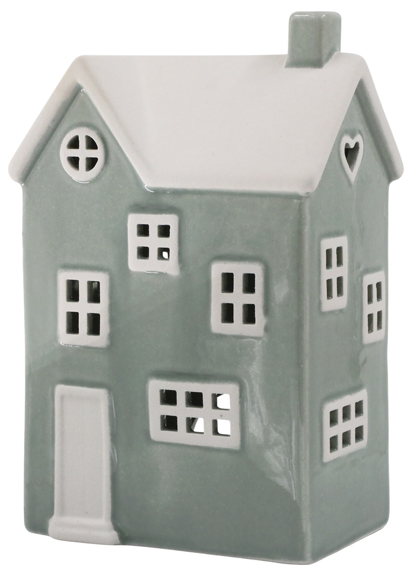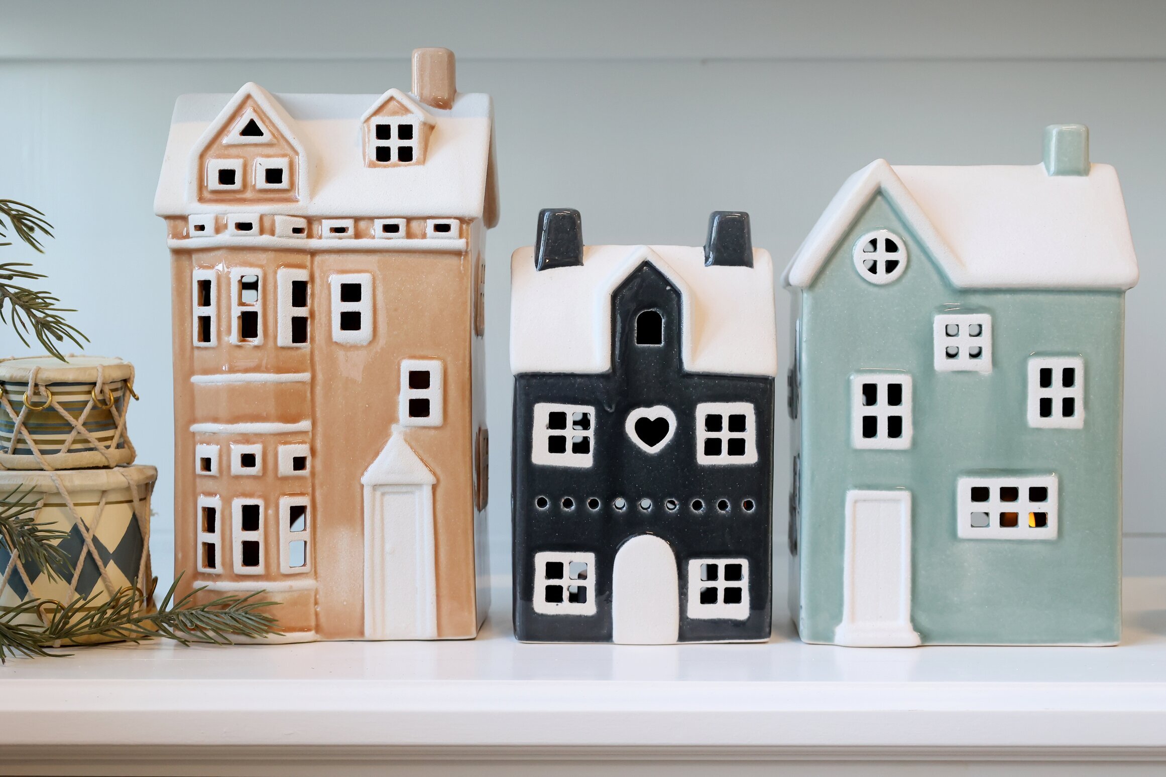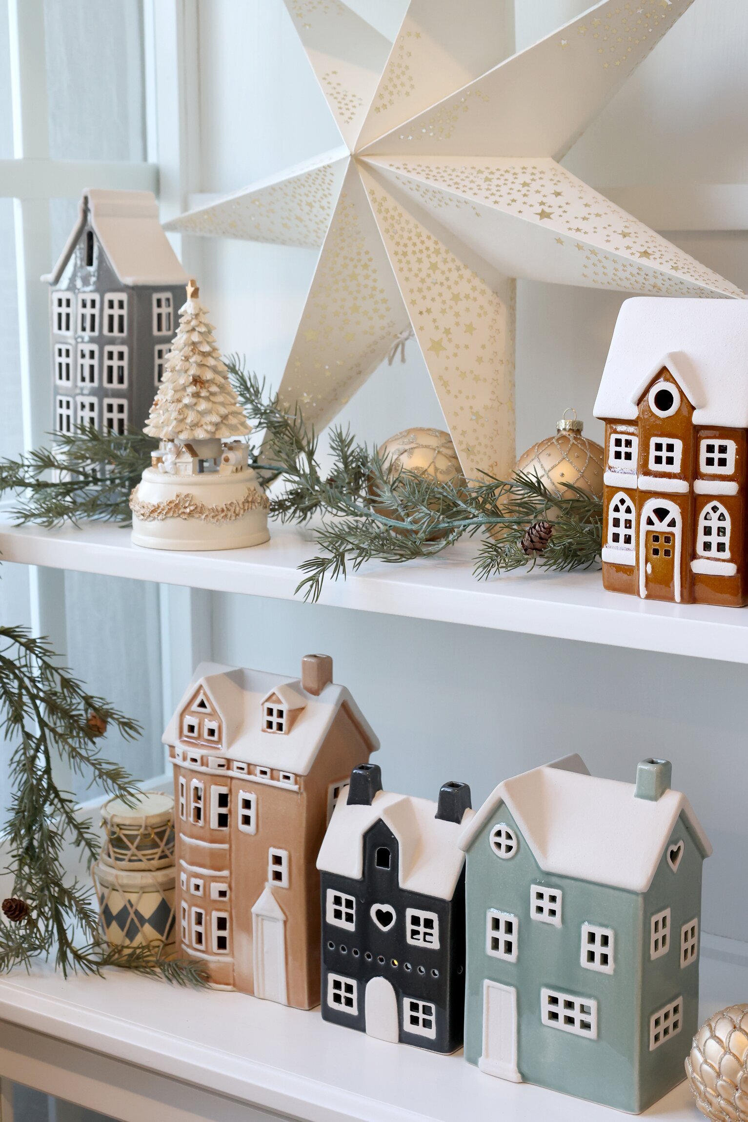 Skapa en mysig och stämningsfull känsla hemma med denna charmiga ljuslykta i form av ett hus. Med sin mjuka färg och snötäckta tak sprider den ett varmt sken när du placerar ett värmeljus inuti.