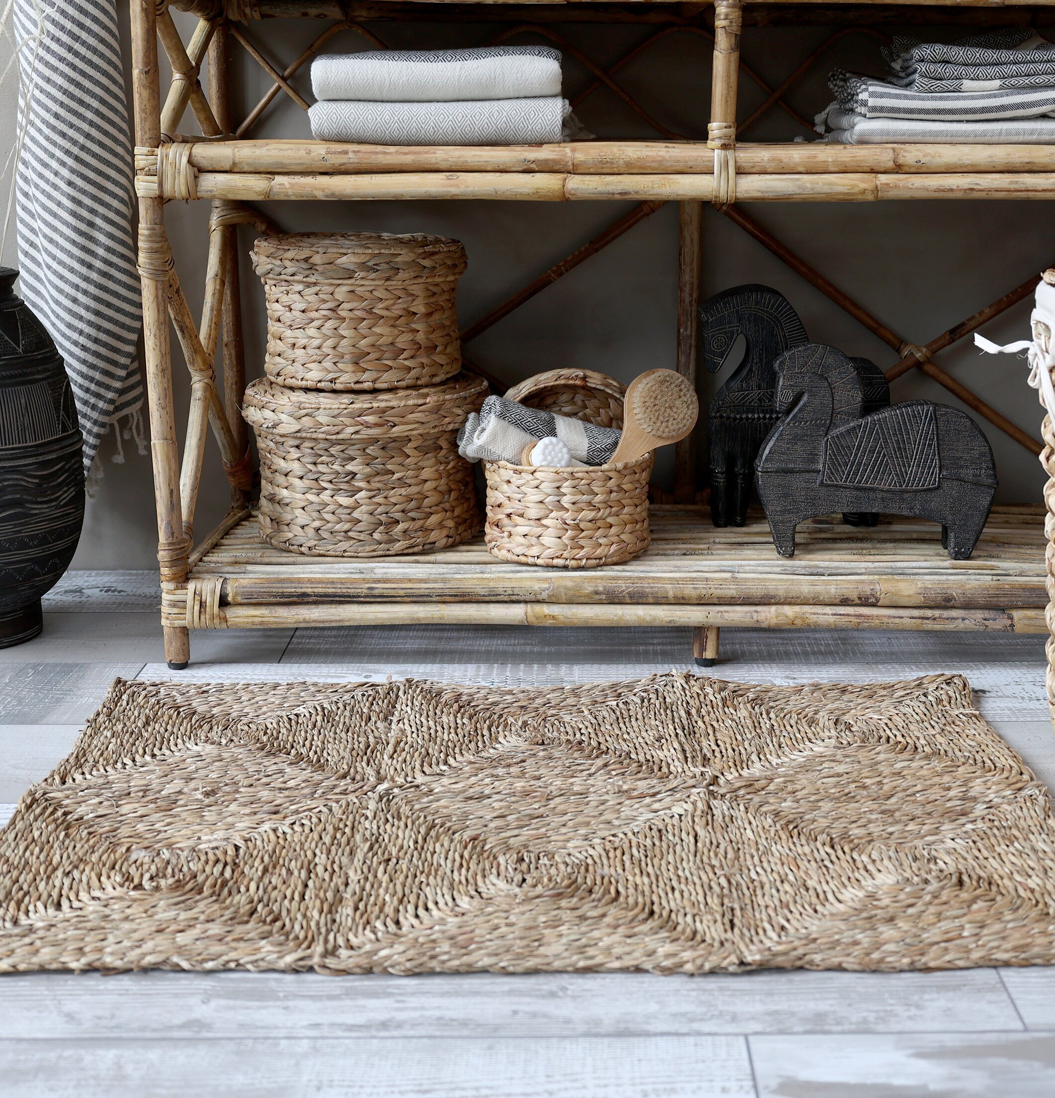Omgivningen på bilden visar att mattan är placerad på ett ljust trägolv i ett rum med en stilfull och harmonisk inredning. Rummet har en avslappnad atmosfär med en blandning av naturmaterial och textiler som kompletterar mattan. Bakom mattan finns en hylla i trä med flera förvaringskorgar, också i flätat sjögräs, vilket skapar en samstämmighet i materialval och design.