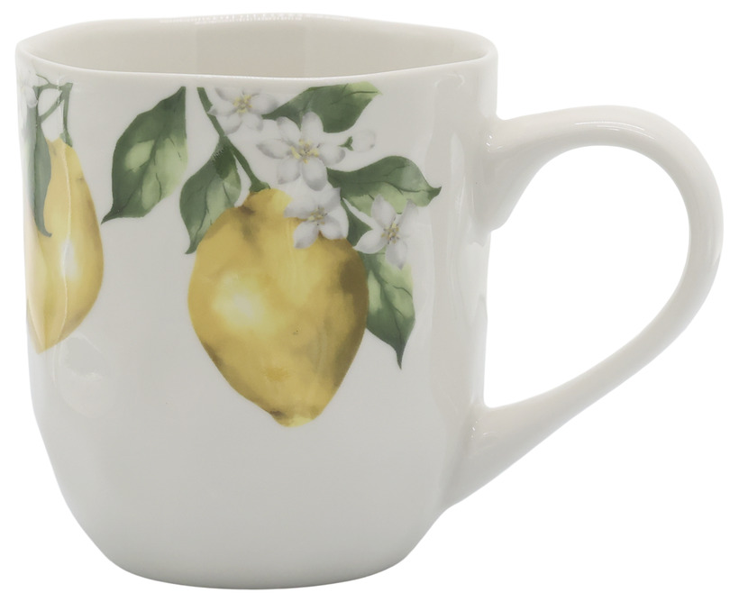 Den mjukt rundade formen ligger skönt i handen och den generösa storleken gör den perfekt för kaffe, te eller en krämig cappuccino. Den vita botten lyfter det citronmönstrade motivet och skapar en fin balans mellan klassiskt och lekfullt.