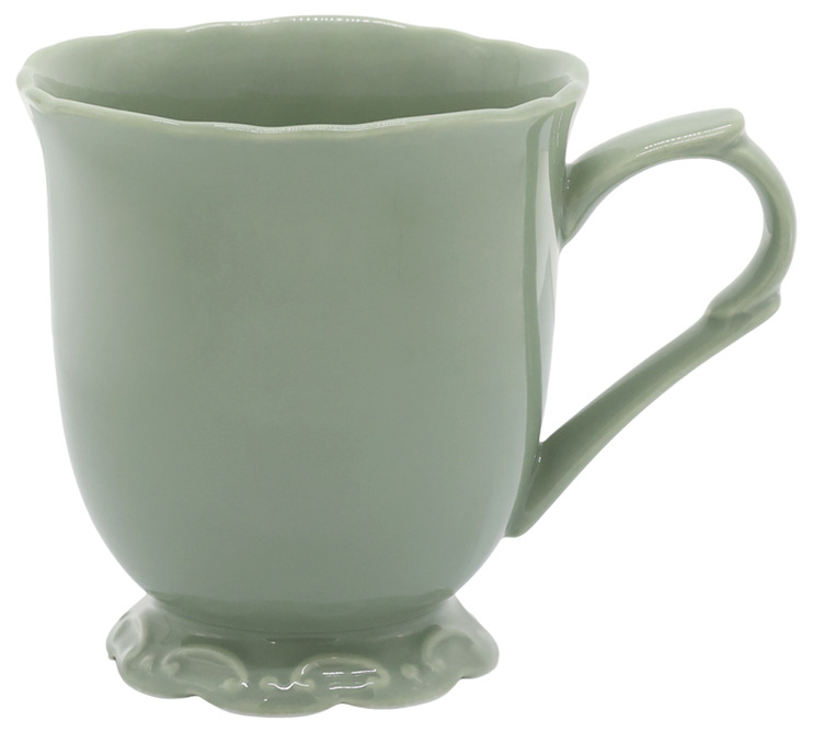 Mugg i keramik med mjukt rundad form och en vacker ljusgrön glasyr som ger ett lugnt och harmoniskt uttryck. De diskreta dekorativa detaljerna vid foten och den svagt vågiga kanten ger muggen en klassisk och tidlös känsla.
