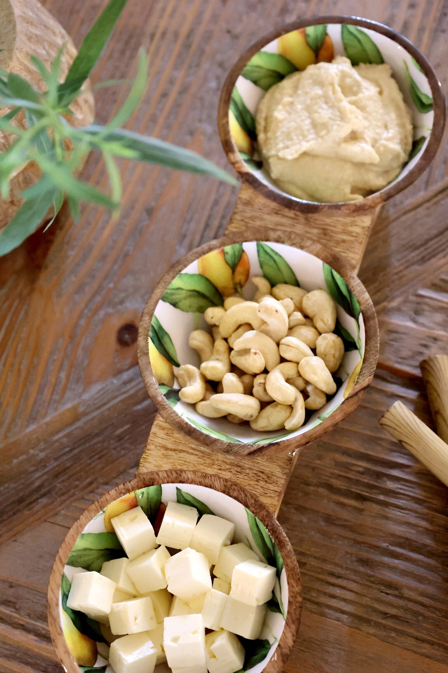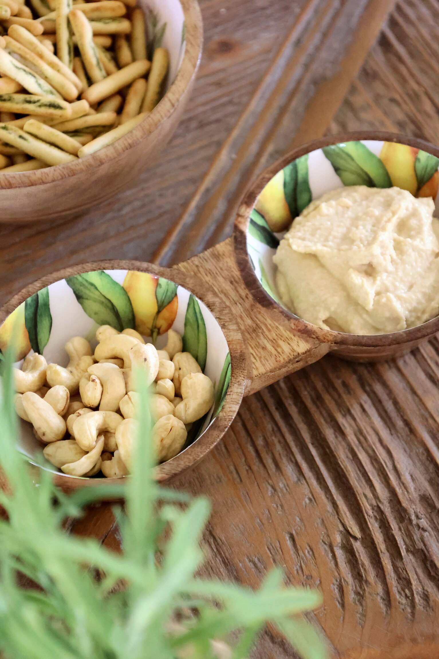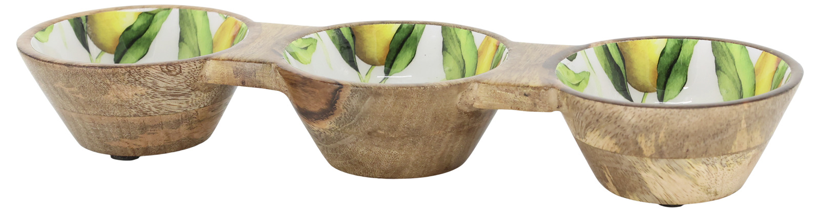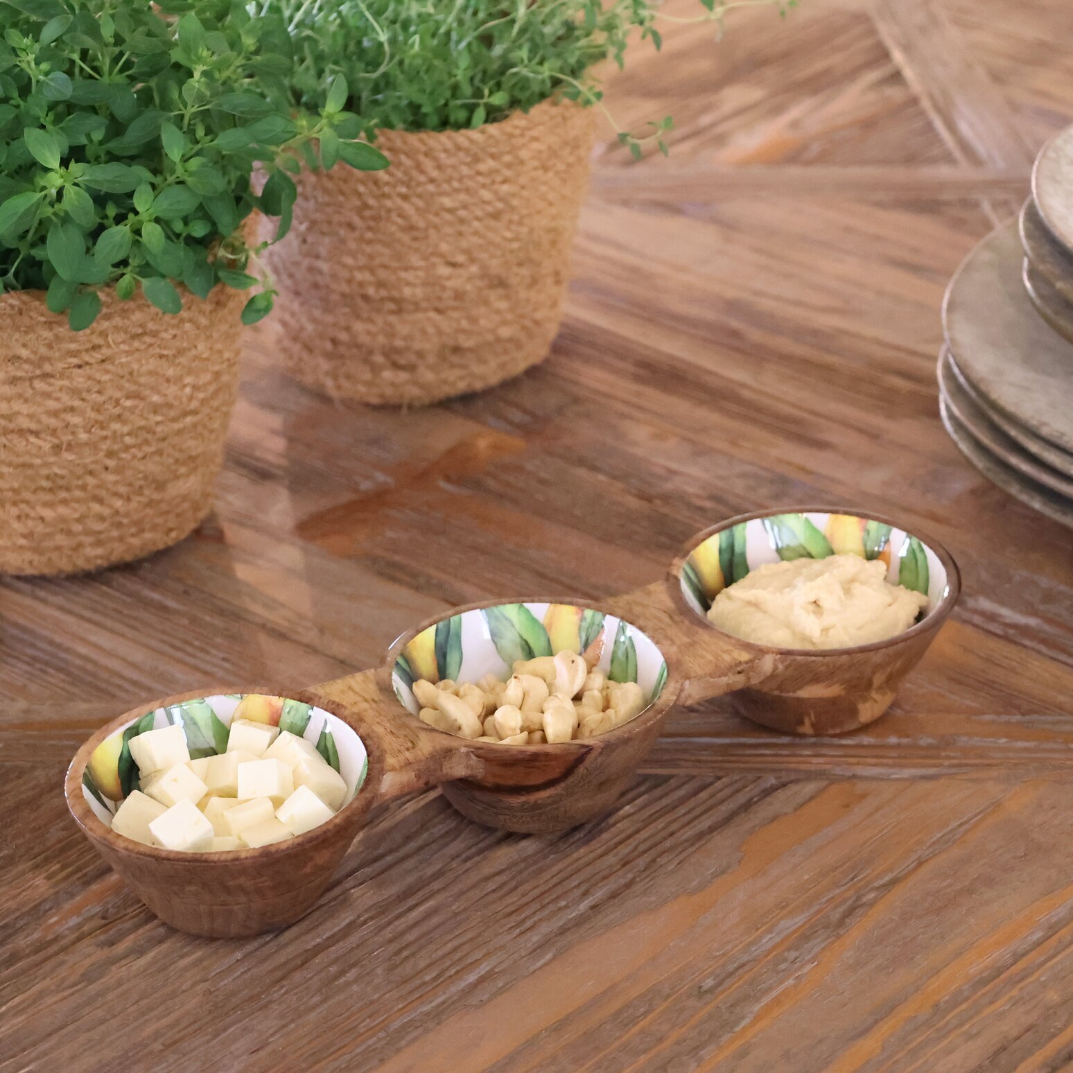 En stilren och varm detalj till dukningen. Denna serveringsskål i mangoträ består av tre sammanfogade skålar med dekorativ insida i friskt, grönt mönster med citroner. Perfekt för nötter, oliver, dipp eller små tilltugg – både till vardag och fest.