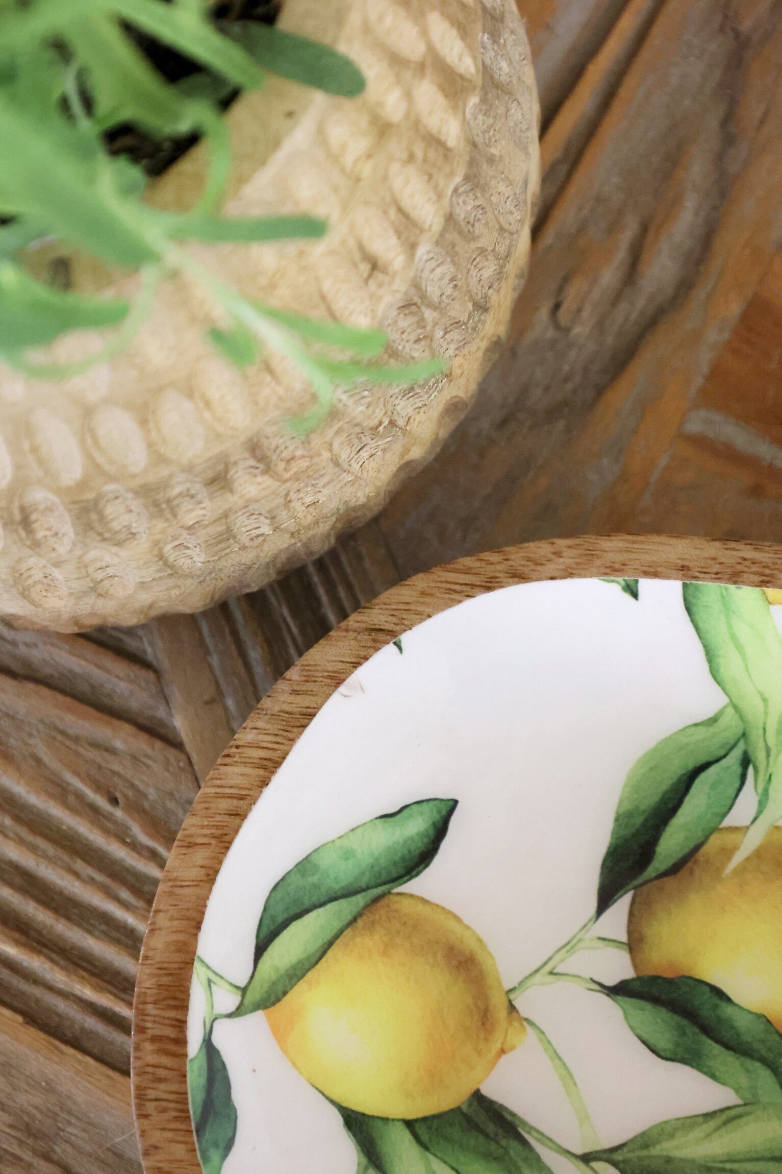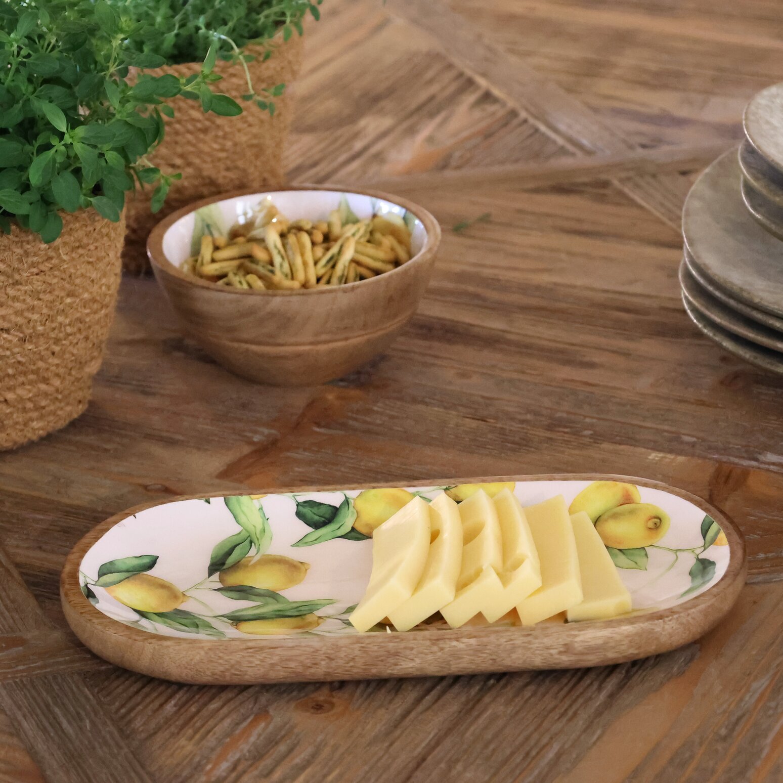 Detta serveringsfat i mangoträ kombinerar naturlig värme med en fräsch, trendig känsla. Den mjuka, ovala formen och den rustika träkanten ramar in det vackra citronmönstret på ett stilrent sätt – perfekt för dig som vill duka både avslappnat och genomtänkt.