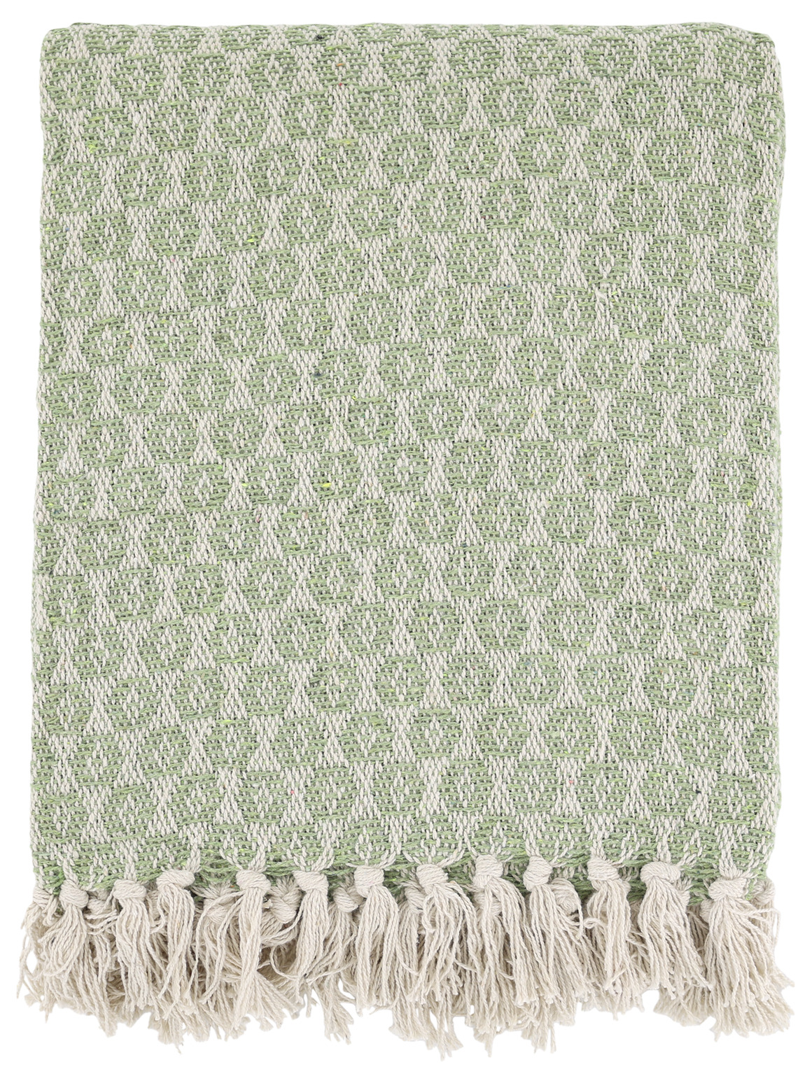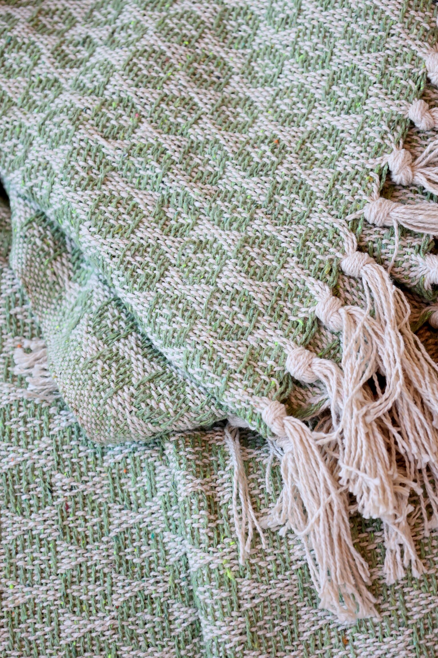 Den lugna gröna färgen för tankarna till naturen och passar perfekt i såväl uterum som vardagsrum eller sovrum. De dekorativa fransarna längs kanten förstärker den ombonade känslan och ger ett avslappnat, inbjudande intryck.
