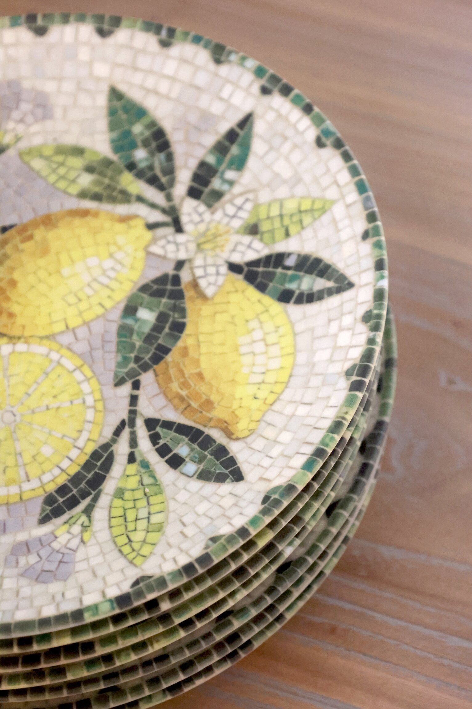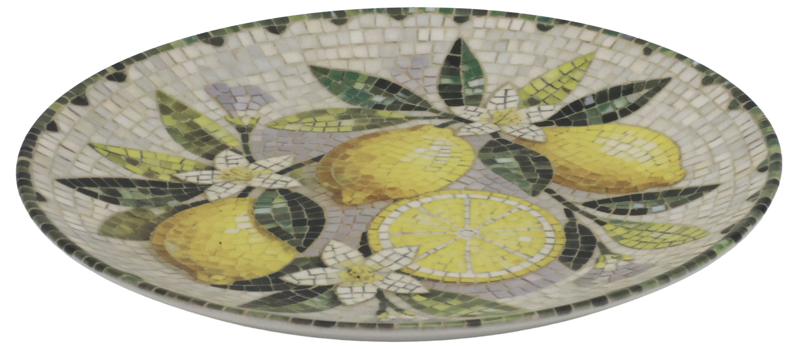 En vacker assiett i stengods med ett dekorativt mosaikmönster som ger en livfull och personlig känsla till dukningen. Den släta ytan gör den både praktisk och behaglig att använda, samtidigt som mönstret skapar ett fint blickfång på bordet.