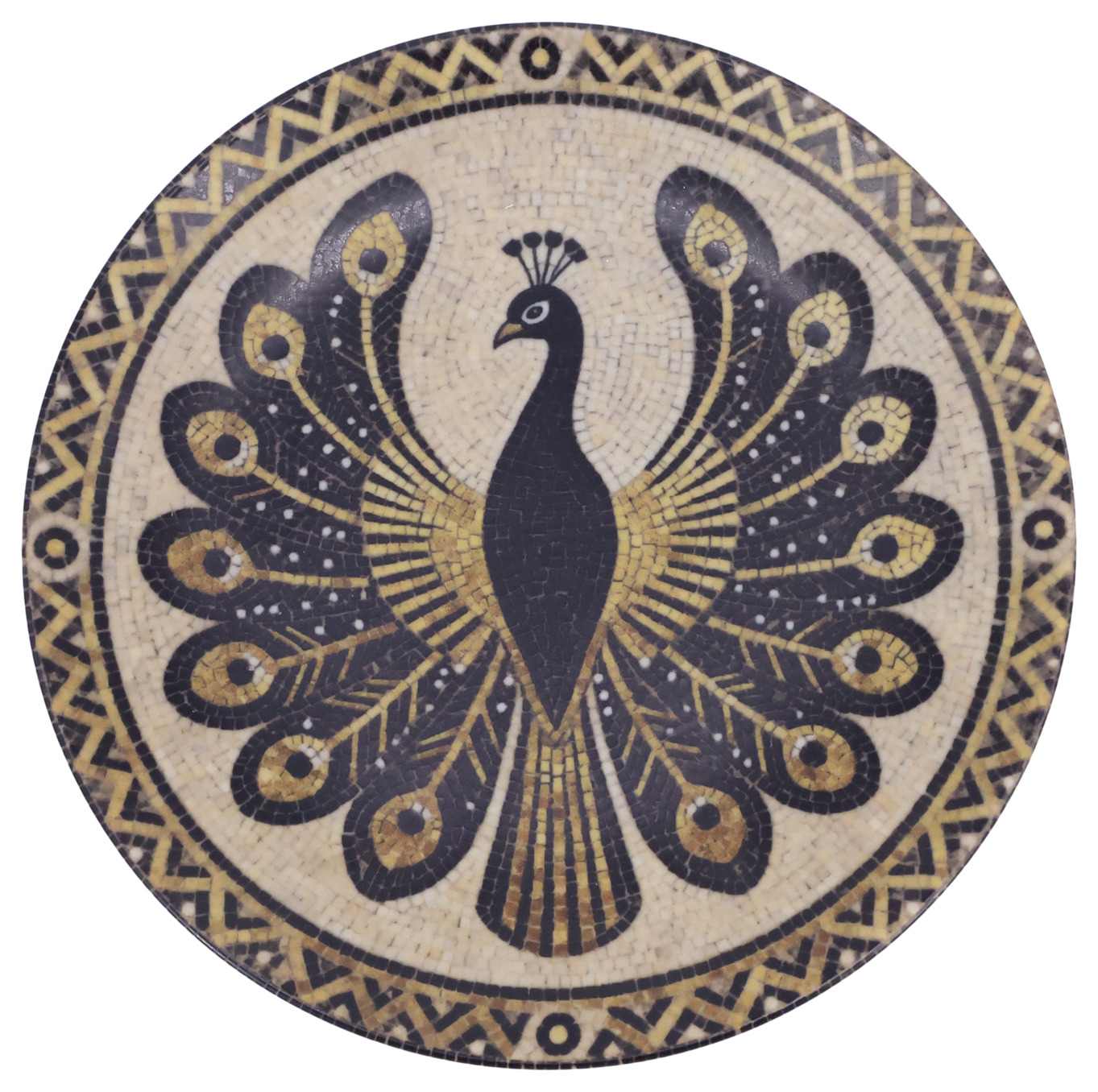 En vacker assiett i stengods med ett dekorativt mosaikmönster som ger en livfull och personlig känsla till dukningen. Den släta ytan gör den både praktisk och behaglig att använda, samtidigt som mönstret skapar ett fint blickfång på bordet.