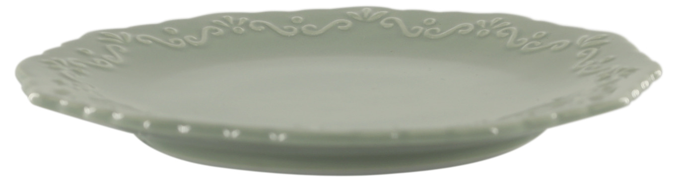 Assiett i porslin med mjukt rundad form och en vacker ljusgrön glasyr som ger ett lugnt och harmoniskt uttryck. Den dekorativa reliefen längs kanten och den svagt vågiga formen ger assietten en klassisk och tidlös känsla.