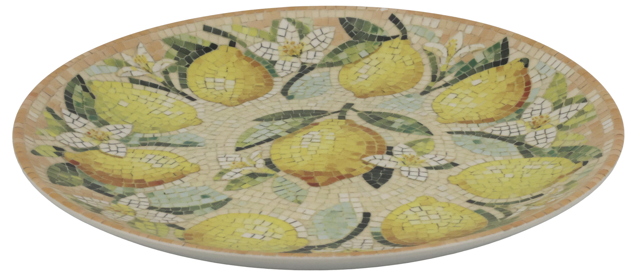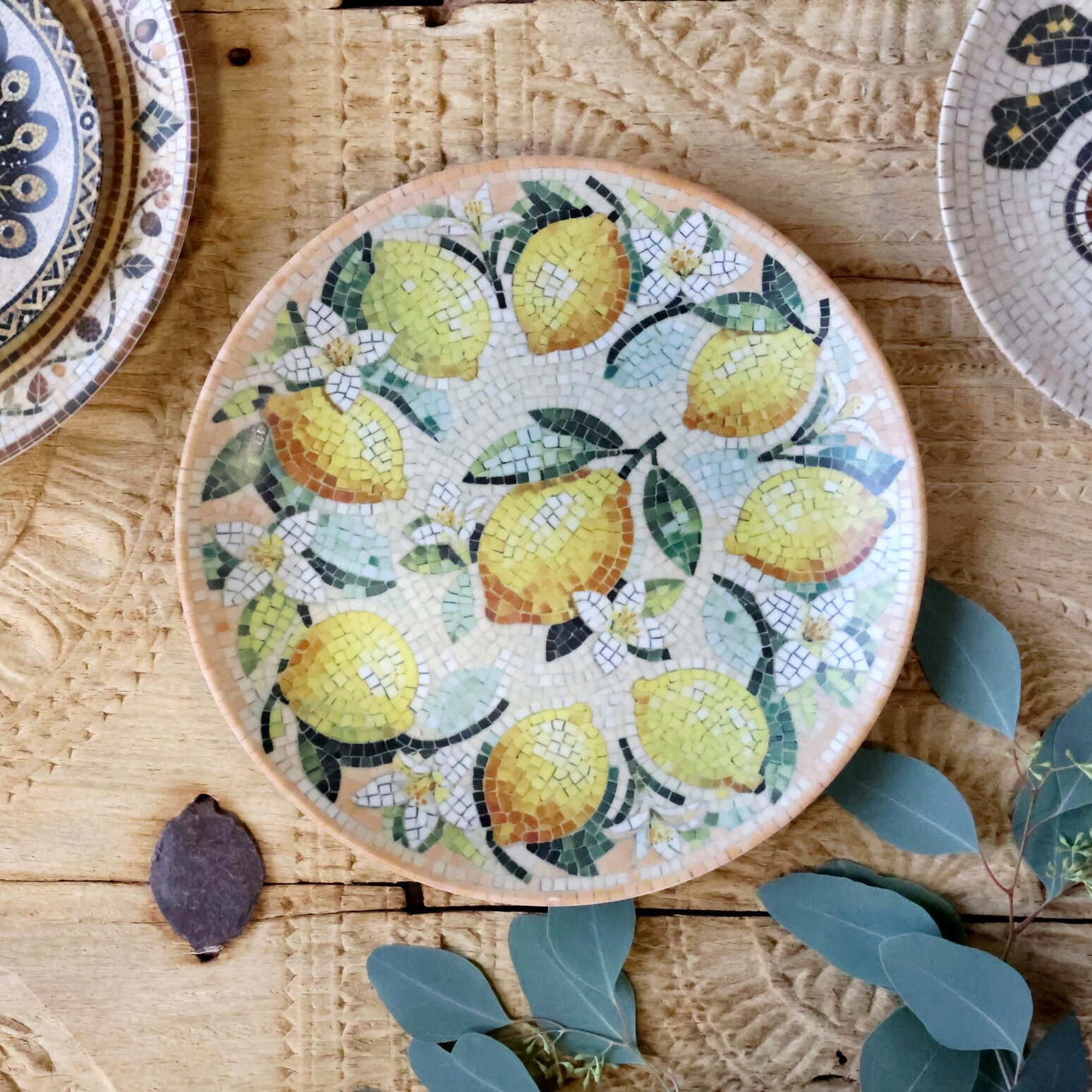 En vacker tallrik i stengods med ett dekorativt mosaikmönster som ger en livfull och personlig känsla till dukningen. Den släta ytan gör den både praktisk och behaglig att använda, samtidigt som mönstret skapar ett fint blickfång på bordet.