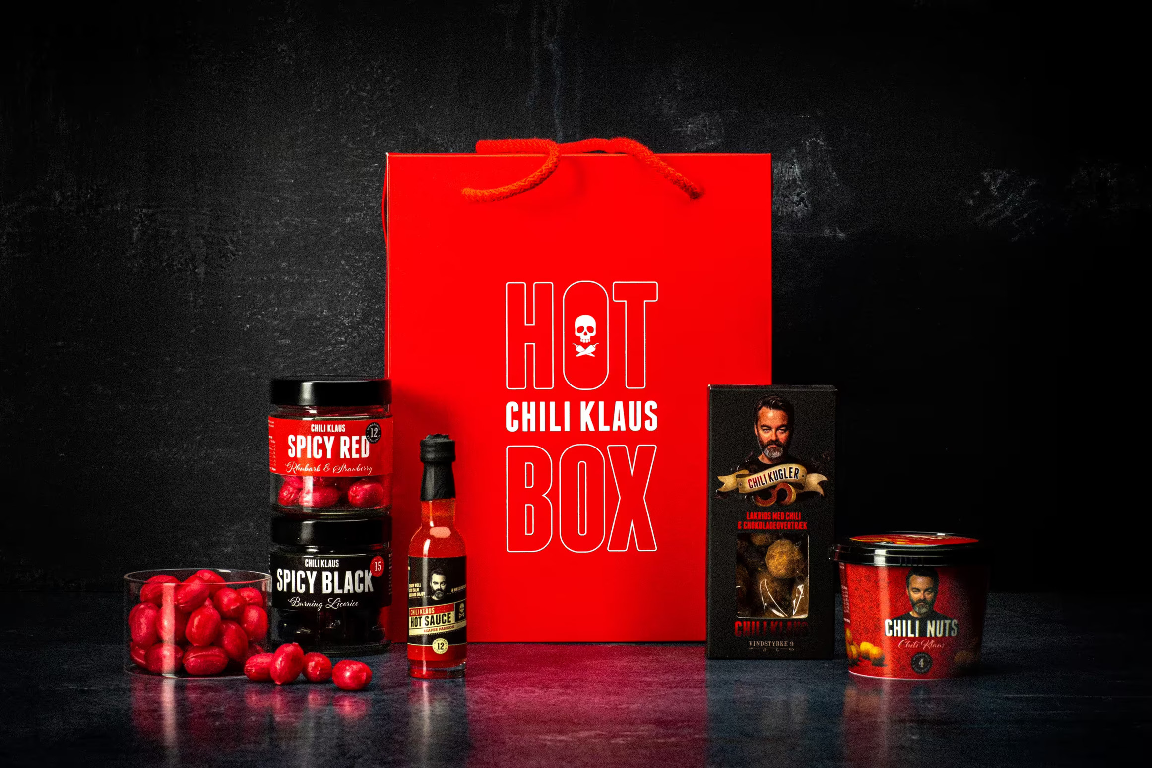 Produkten som syns på bilden är Hot Box Red från varumärket Chili Klaus. Hot Box Red är en smakfull presentförpackning som består av flera olika chilibaserade produkter, vilket gör den till en perfekt gåva för chilientusiaster.