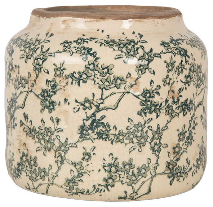 En dekorativ kruka med mjuk romantik och tidlös elegans. Det detaljrika mönstret av blommande grenar i dämpade gröna toner mot den varma, ljusa botten ger krukan ett harmoniskt och sofistikerat uttryck. Den rundade formen tillsammans med den lätt antika finishen skapar en vacker balans mellan klassisk charm och lantlig lyx.