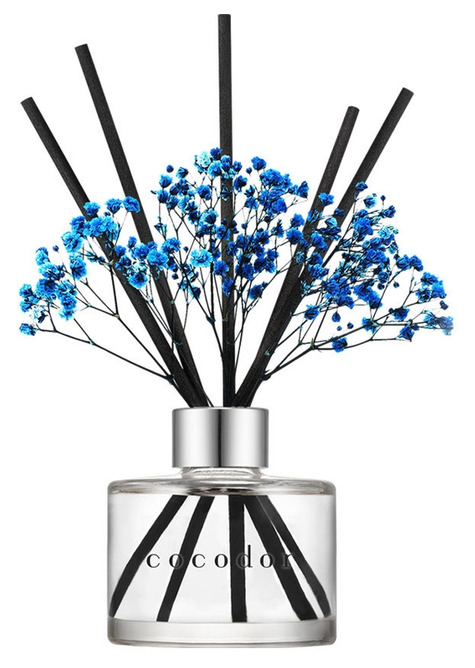 En vacker doftspridare som kombinerar stilren design med en härlig doftupplevelse. De blå brudslöjeblommorna tillsammans med svarta pinnar ger ett exklusivt och modernt uttryck som passar perfekt i både vardagsrum, sovrum och badrum.