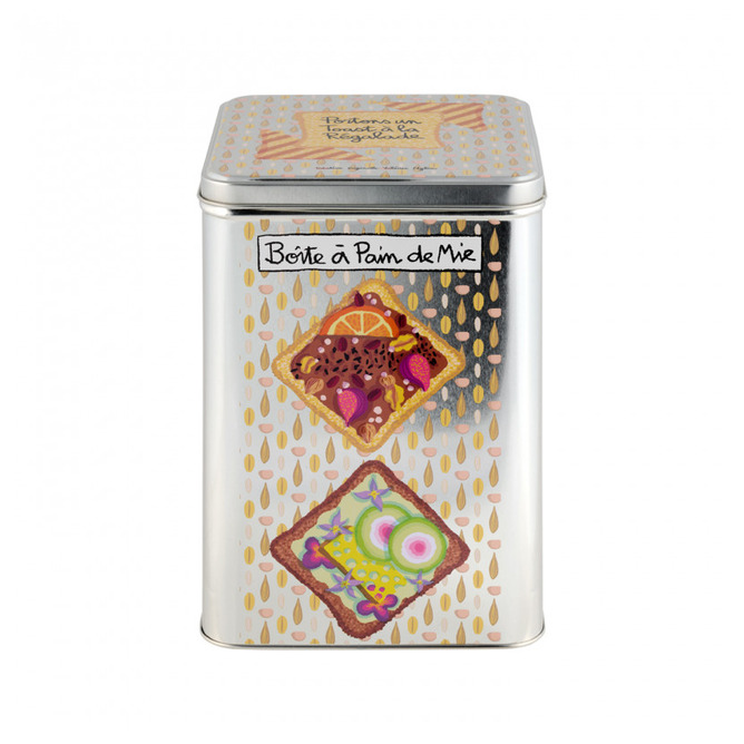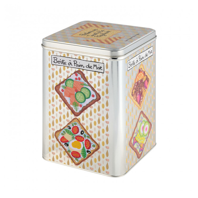 En dekorativ plåtburk perfekt för förvaring av bröd, knäckebröd eller andra torra livsmedel. Burken har ett färgglatt motiv med olika smörgåsar som ger ett lekfullt och aptitligt intryck i köket.