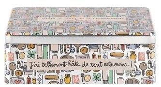 Denna dekorativa plåtburk är perfekt för att samla småprylar, minnessaker eller annat som annars lätt försvinner. Med sitt lekfulla mönster och franska text blir den både en praktisk förvaringslösning och en fin detalj i hemmet. Placera den i köket, hallen eller på skrivbordet – var du än vill ha ordning med stil.