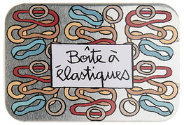 Mitt i detta färgglada mönster finns en vit etikettliknande ruta med texten "Boîte à élastiques" skriven i en handskriftsstil. Textens placering och stil ger burken ett personligt uttryck och förstärker temat med fokus på vardagliga förvaringslösningar.