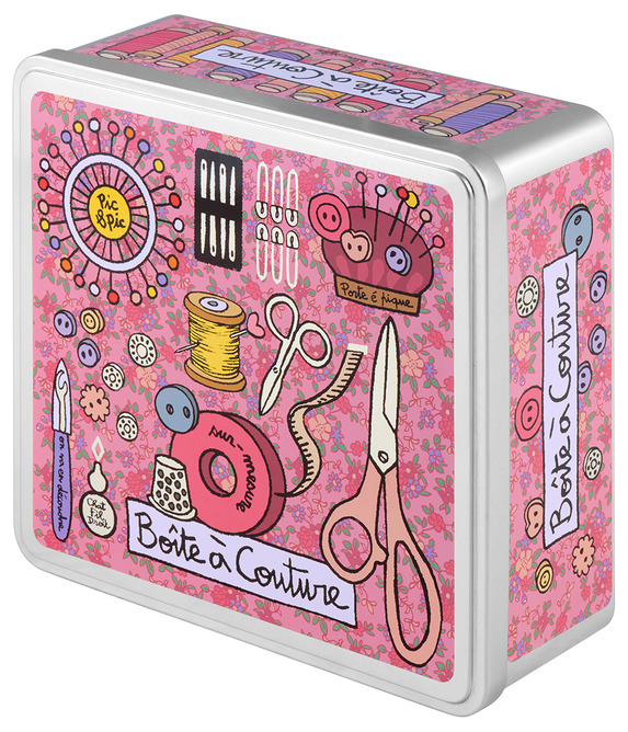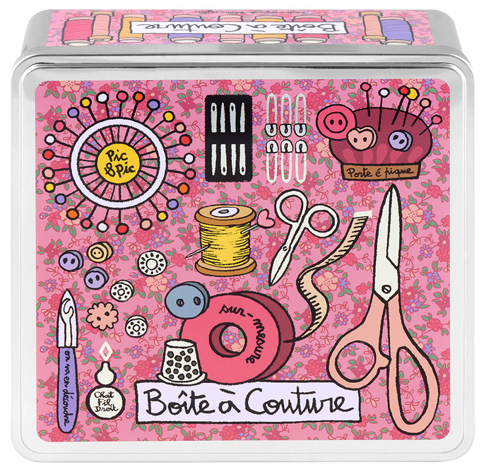 Plåtburk till förvaring av allt som kan tänkas behövas vid sömnad, saxar, nålar, tråd & måttband mm.