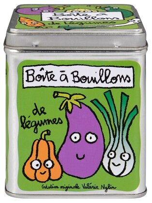 Framsidan av plåtburken domineras av en grön bakgrund. På denna bakgrund syns tre stiliserade grönsaker: en lila aubergine, en orange pumpa och en vit och grön purjolök. Grönsakerna har gulliga ansikten som bidrar till det lekfulla intrycket. Ovanför grönsakerna finns texten "Bôite à Bouillons de légumes", vilket anger att burken är avsedd för buljongkuber gjorda av grönsaker. Texten är skriven i en avslappnad och handskriven stil, vilket förstärker produkten från Derrière la porte som en personlig och konstnärlig skapelse.