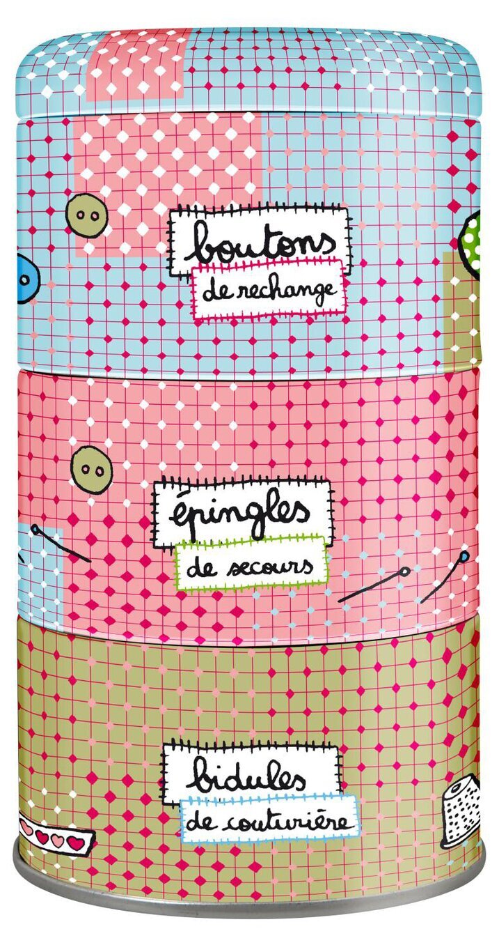 Den mellersta delen av burken har texten “épingles de secours”, som indikerar att denna del kan användas för förvaring av säkerhetsnålar. Designen här inkluderar illustrationer av nålar, kombinerade med samma rutiga bakgrund och charmiga sömdetaljer runt texten.