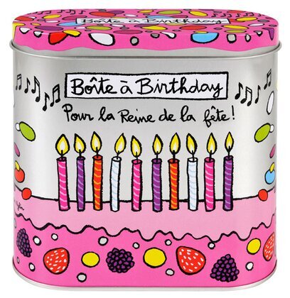 Plåtburk för förvaring. När man vrider upp snurran spelas Happy Birthday to You.