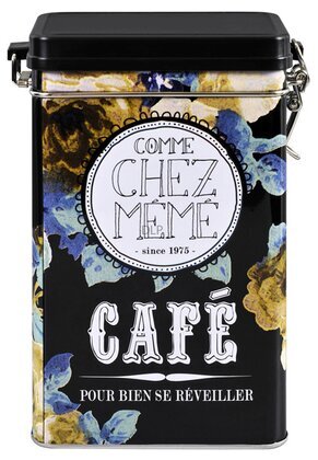 Förvara ditt kaffe i denna stilfulla plåtburk med knäpplock. Plåtburken är svart i basen med blå och beige/gula blommor.
