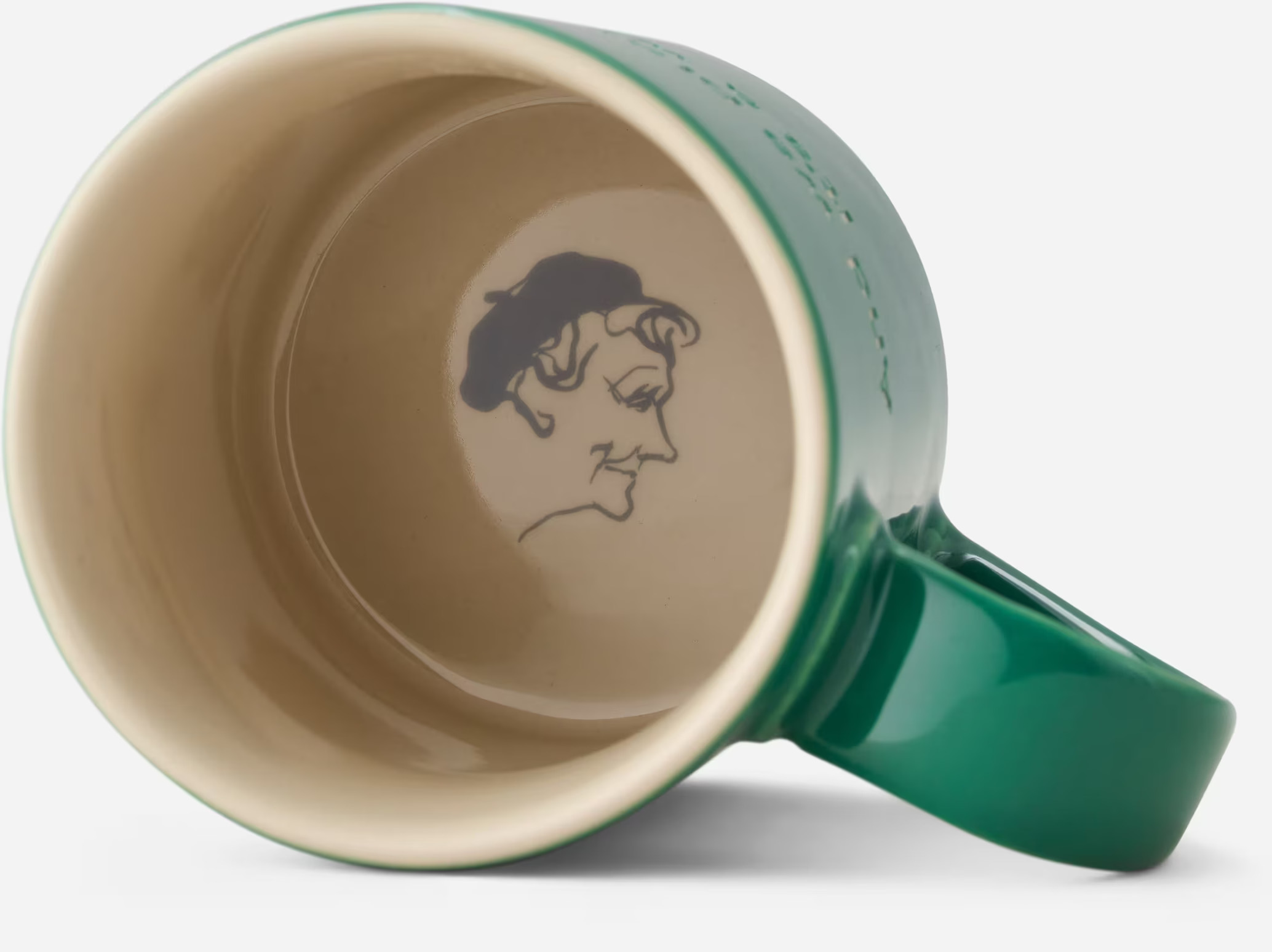 Insidans ljusa, krämfärgade glasyr skapar en behaglig kontrast mot muggens mörkgröna yttersida och ger en mjuk känsla mot läpparna vid användning. Ett särskilt unikt inslag i muggen är den diskreta porträttbilden av Astrid Lindgren som pryder muggens botten. Detta lilla konstverk är inte bara en hyllning till författarens kulturarv, utan också en trevlig överraskning som blir synlig när drycken når botten.