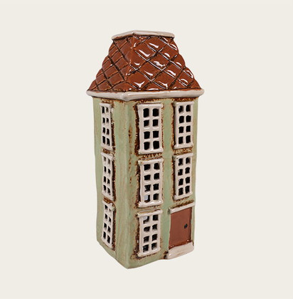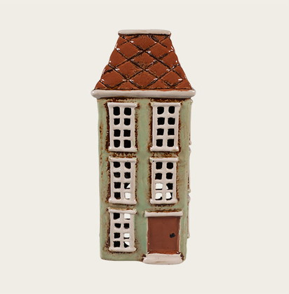Skapa ett varmt, mjukt sken med den här charmiga huslyktan – ett smalt litet stadshus med vackra detaljer, grön fasad och ett tegelfärgat tak. När du tänder ett värmeljus lyser det genom de många fönstren och ger rummet en ombonad, hemtrevlig känsla.