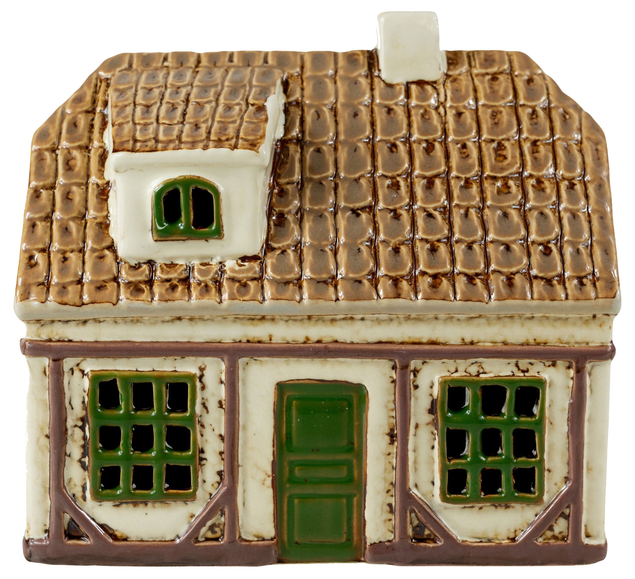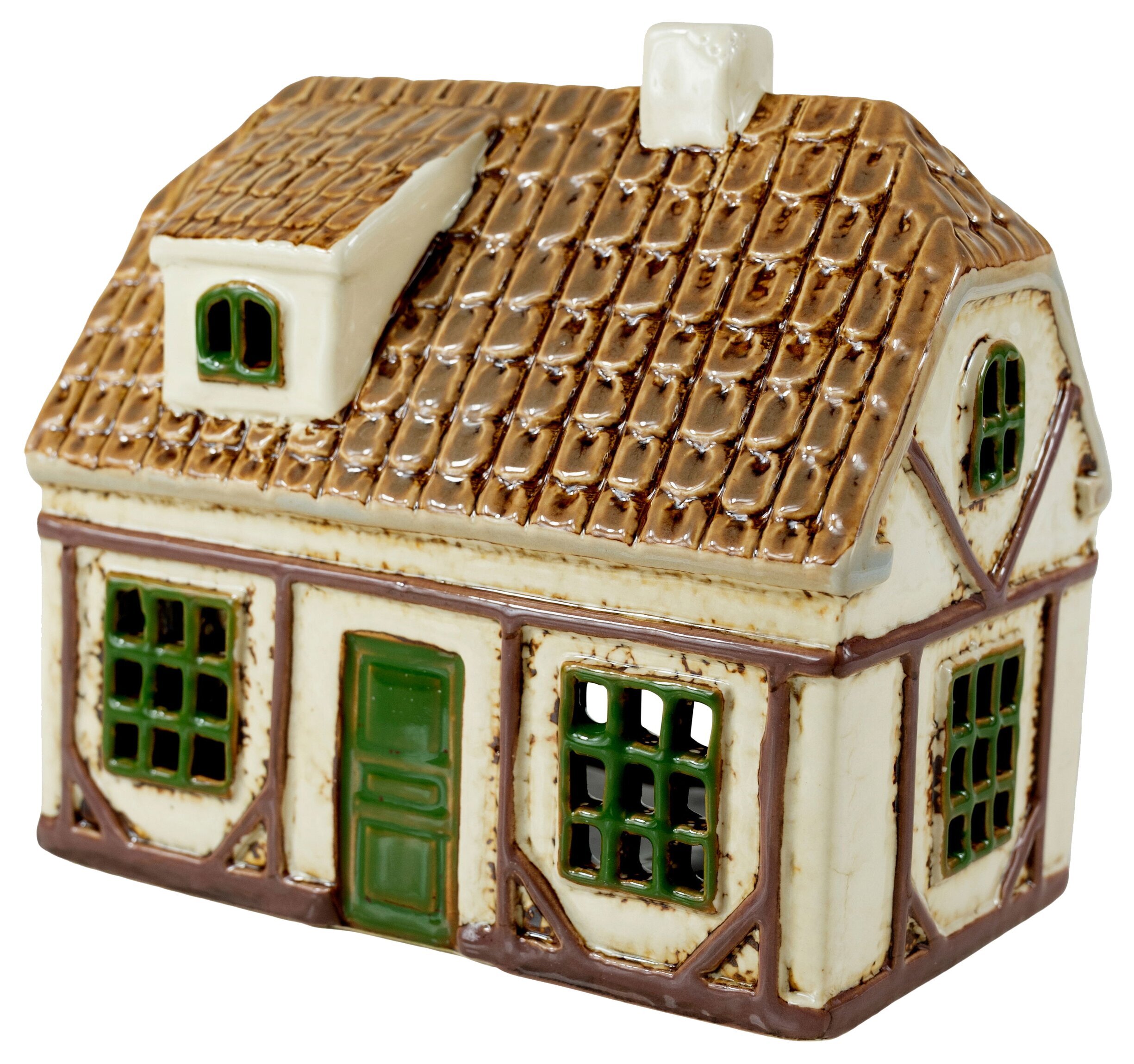 Denna vackra ljuslykta är utformad som ett litet charmigt hus med fina detaljer, klassiska fönster och ett tak i varm, glaserad ton. Den gedigna keramiken och de dekorativa linjerna ger ett genuint, nästan sagolikt uttryck som gör lyktan till en vacker detalj i ditt hem – oavsett årstid.