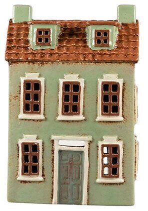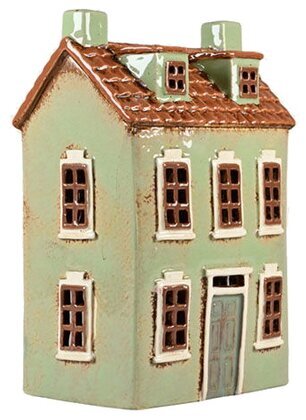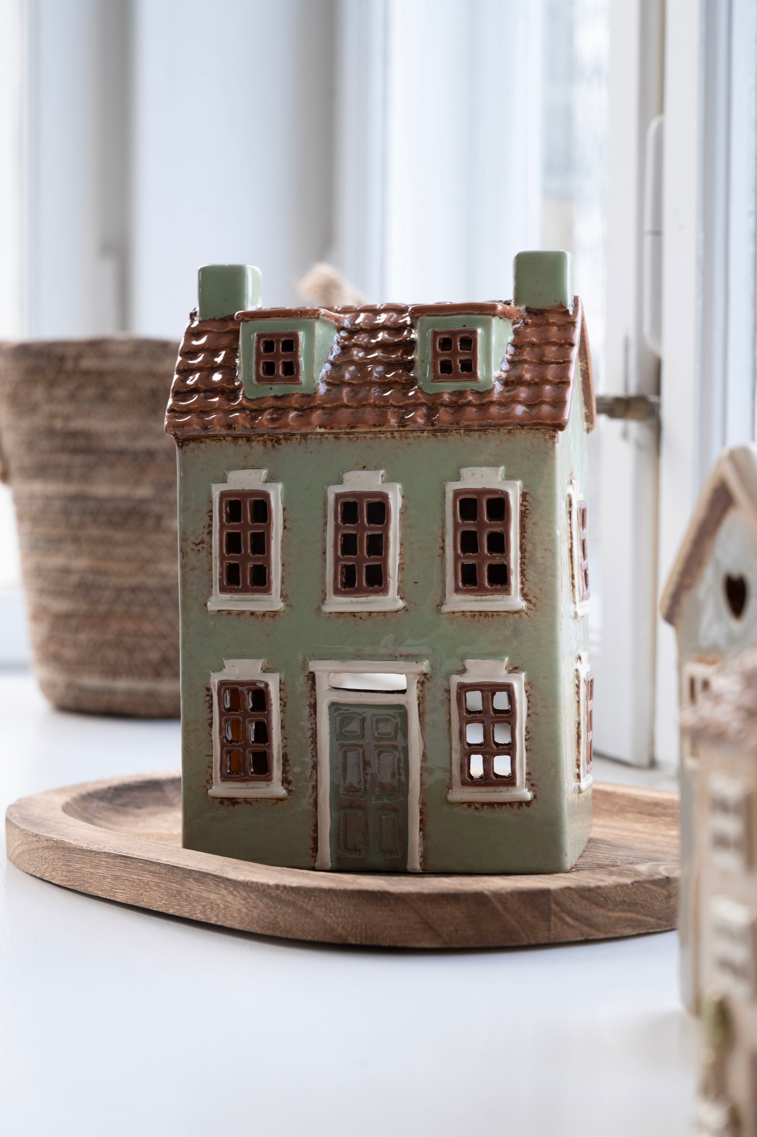 Ett charmigt ljushus i keramik med gröna väggar och tegelfärgat tak, inspirerat av klassiska stadshus. När du tänder ett värmeljus sprider sig ett varmt och stämningsfullt sken genom de små fönstren och skapar en mysig atmosfär i hemmet.